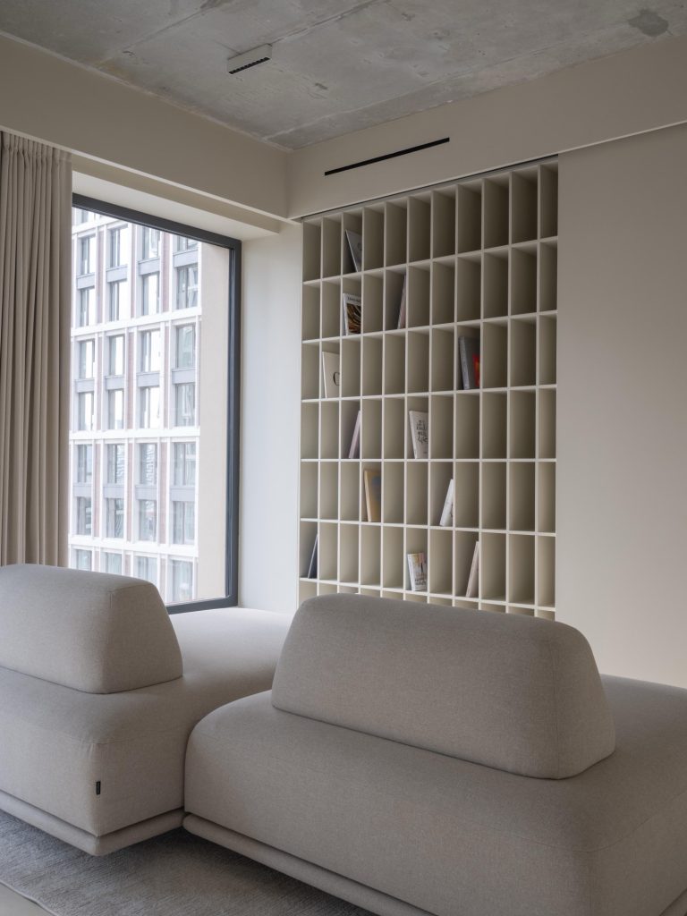 Krisanova’s project adopts this logic as both conceptual and spatial foundation. The so called Kikutake Room, anchored by a library, becomes the central connective element around which the entire apartment is organized. Geometry, color, and placement of every interior component are governed by the idea of modularity, understood not as stylistic reference but as a structural principle of living. The result is an interior that treats transformation as an everyday condition rather than a dramatic event.