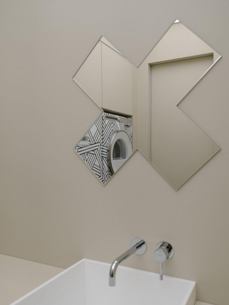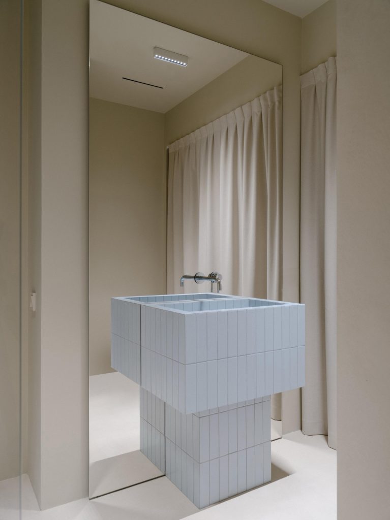 In the main bathroom, the sink operates as a sculptural volume that transitions into a cuboid form through its seamless reflection in a mirror placed behind it. The boundary between object and image collapses, reinforcing the project’s ongoing dialogue between material presence and spatial illusion.