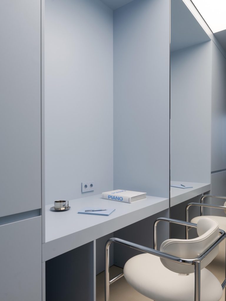 The chosen shade establishes continuity between vertical and horizontal planes, allowing surfaces to flow seamlessly into one another. Rather than functioning as neutral background, color here operates as a calibrating device, ensuring that light, reflection, and geometry remain in equilibrium. The sky accent emerges not as decorative gesture but as spatial counterpoint within a carefully controlled chromatic field.