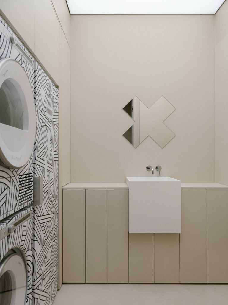 The guest bathroom incorporates a limited edition ASKO x Maxim Kashin Architects home laundry unit, featuring Maxim Kashin’s Suprematist pattern. Produced in a series of ten to commemorate Kazimir Malevich’s first Suprematist exhibition, 0.10, the appliance situates the domestic interior within a broader lineage of avant garde experimentation.