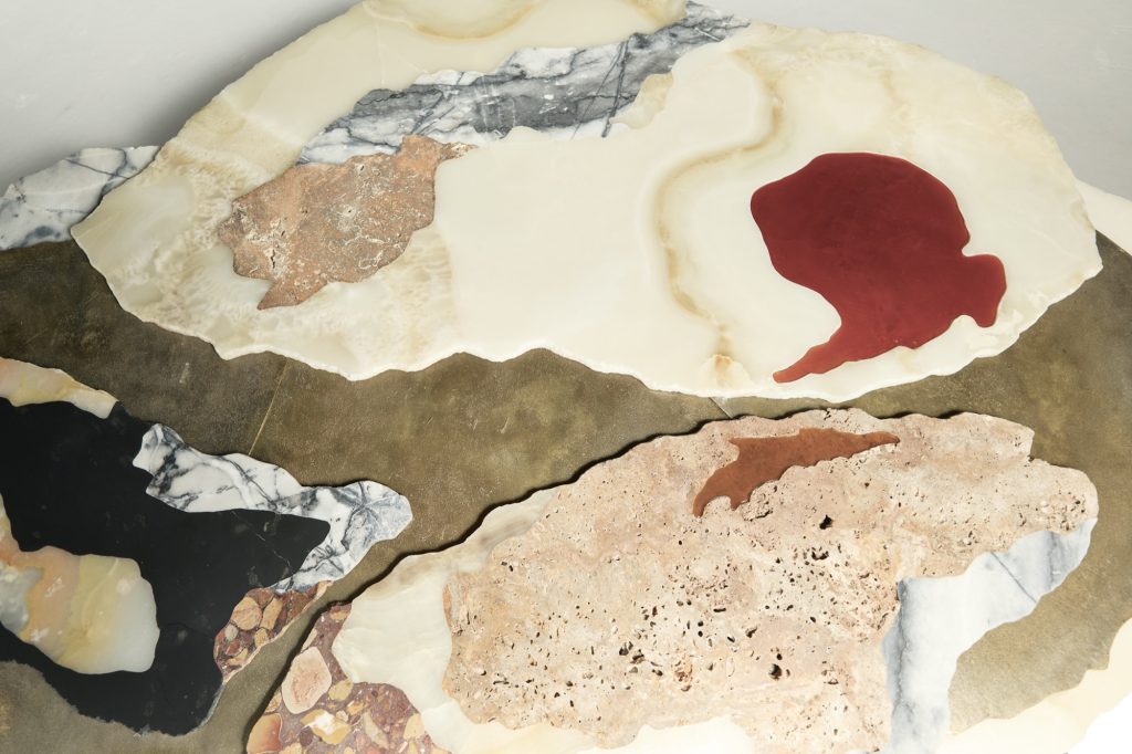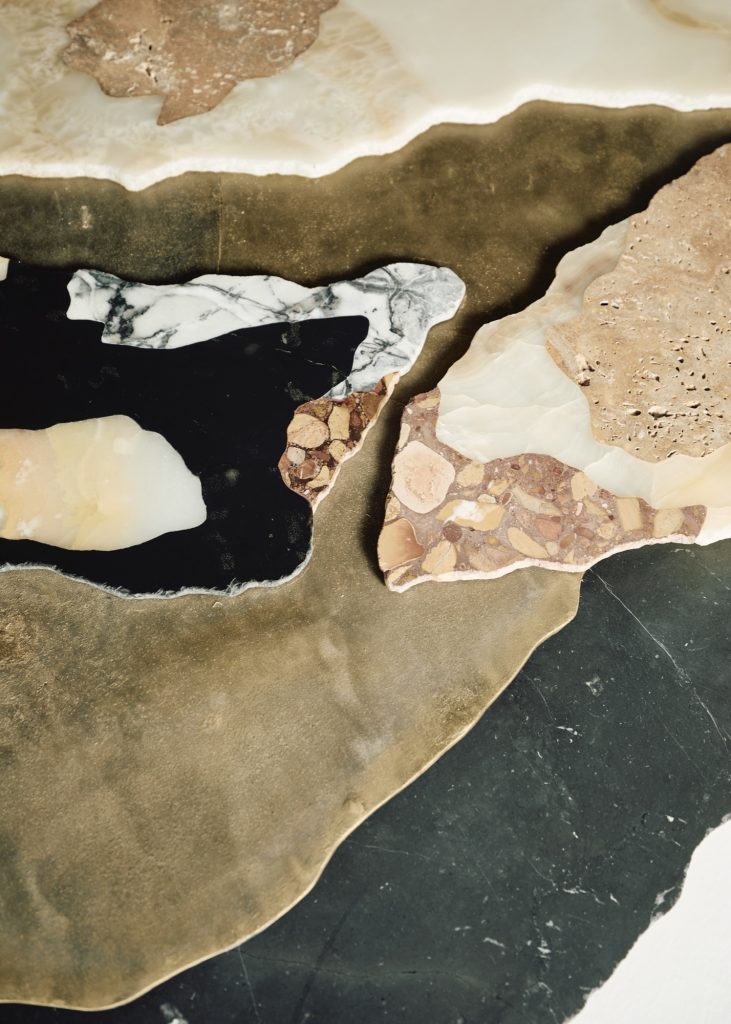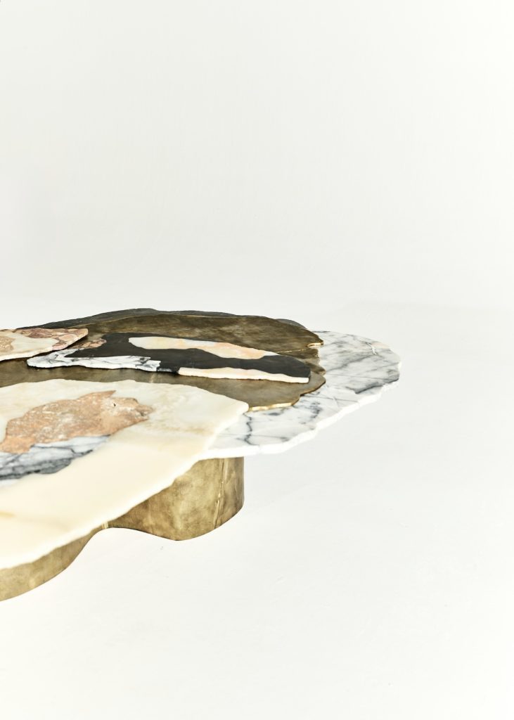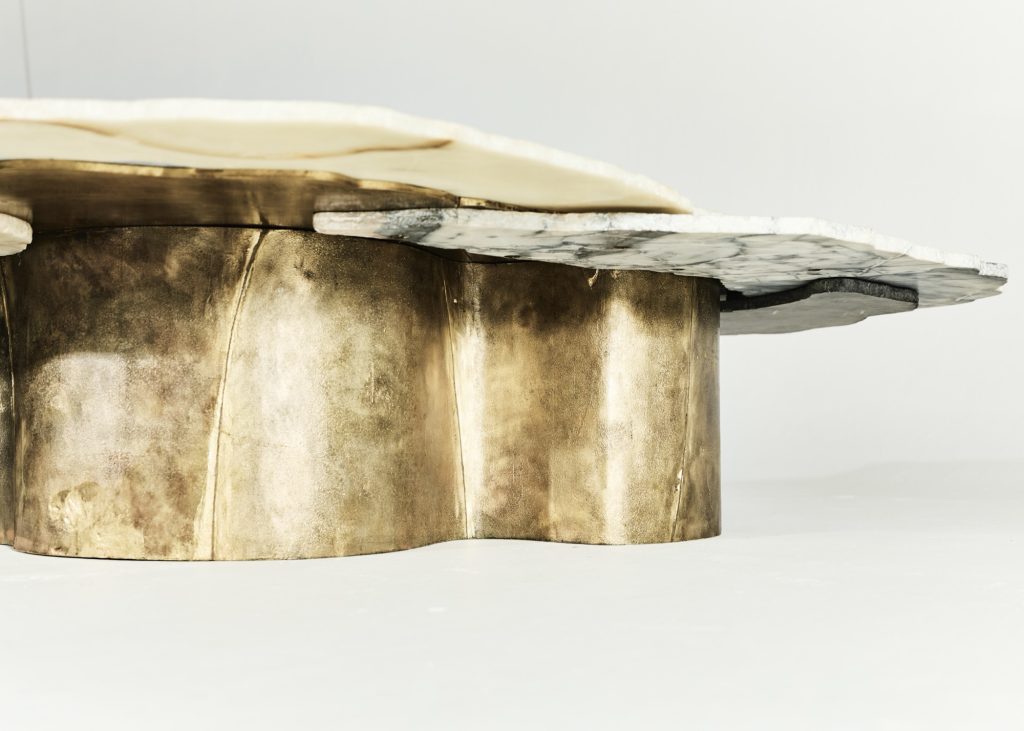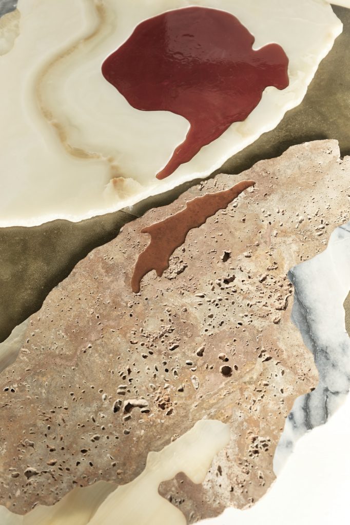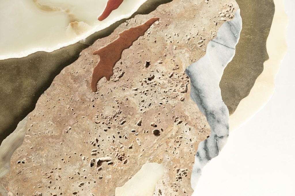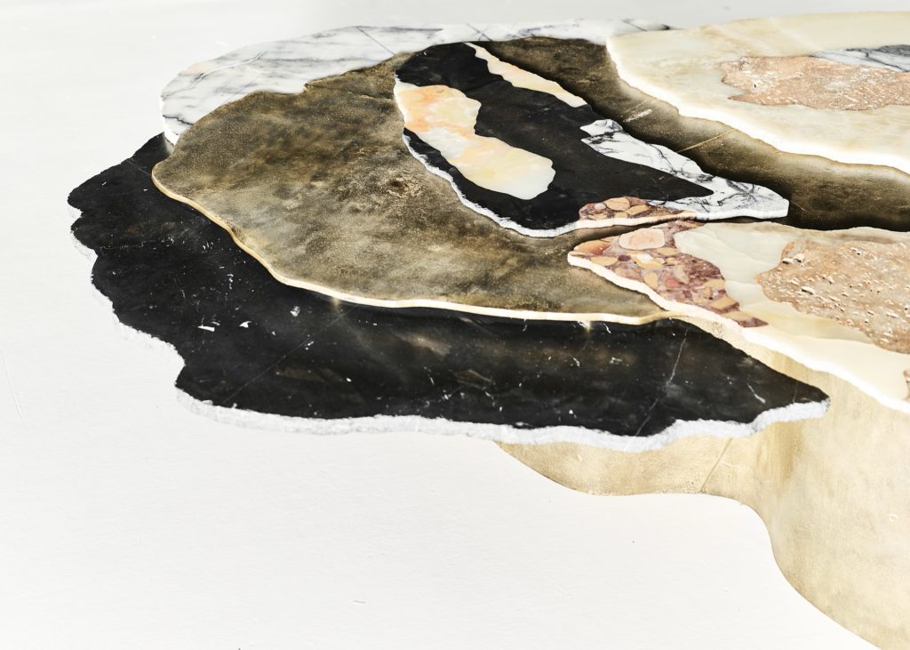 Viewed from above, the sculpture evokes the aerial perspective of an emerging island. Recycled bronze forms a rugged terrain scattered with fragments of marble and onyx, while translucent resin appears to capture molten flows in mid-transformation. The composition presents a moment suspended between liquidity and solidification, as if the island were still cooling after eruption.