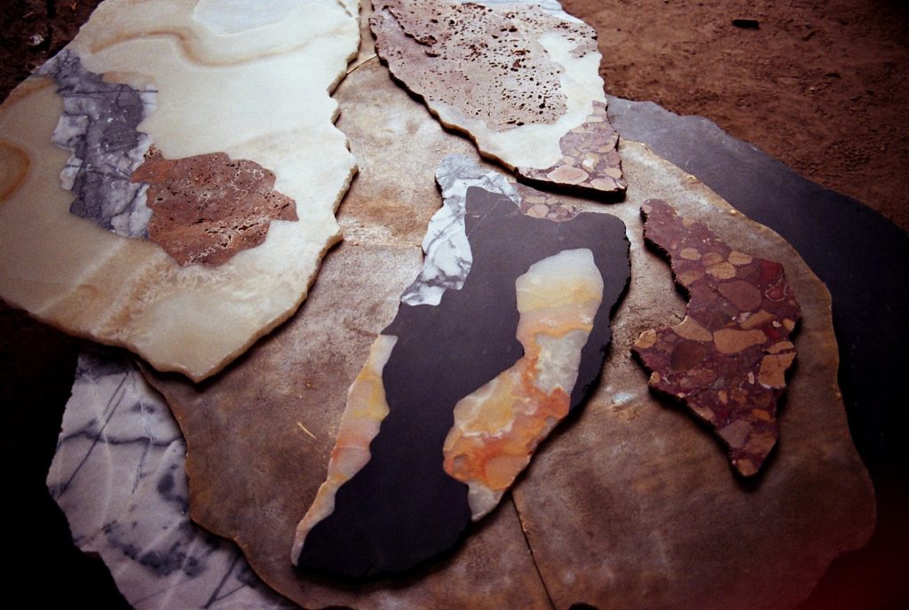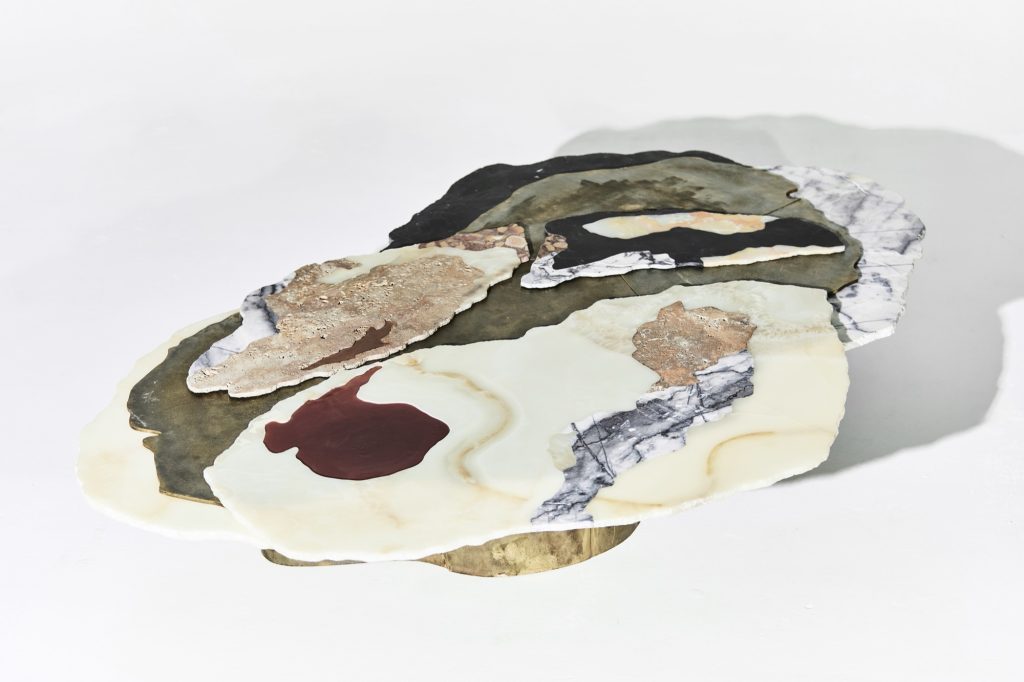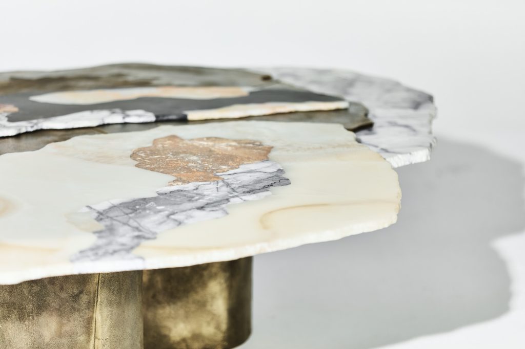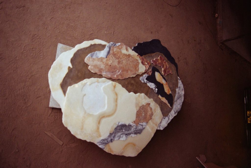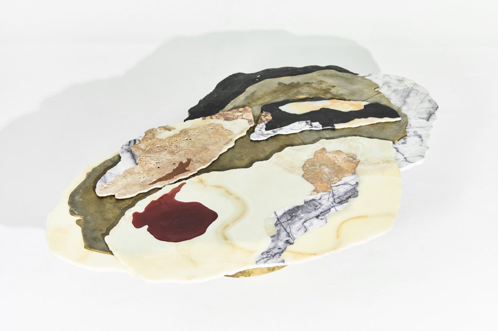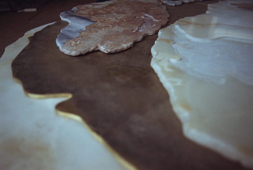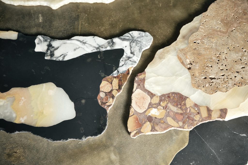 Viewed from above, the sculpture evokes the aerial perspective of an emerging island. Recycled bronze forms a rugged terrain scattered with fragments of marble and onyx, while translucent resin appears to capture molten flows in mid-transformation. The composition presents a moment suspended between liquidity and solidification, as if the island were still cooling after eruption.