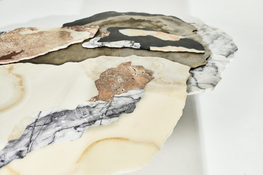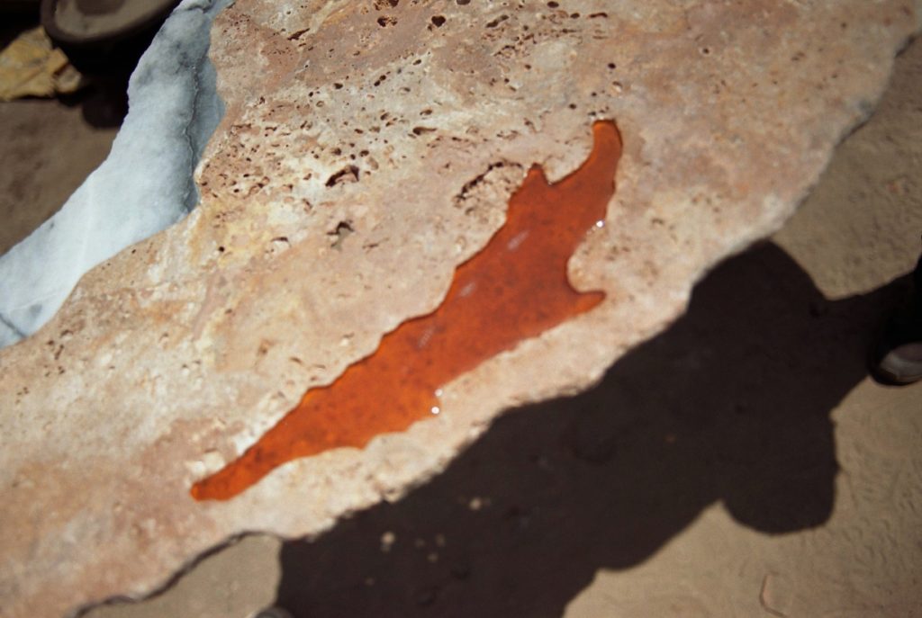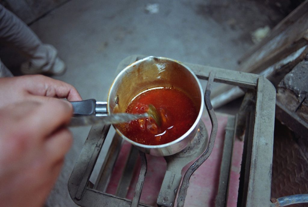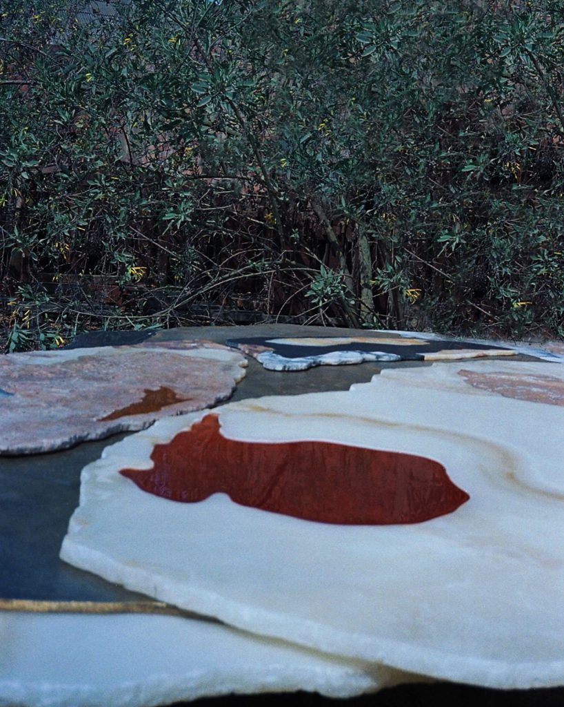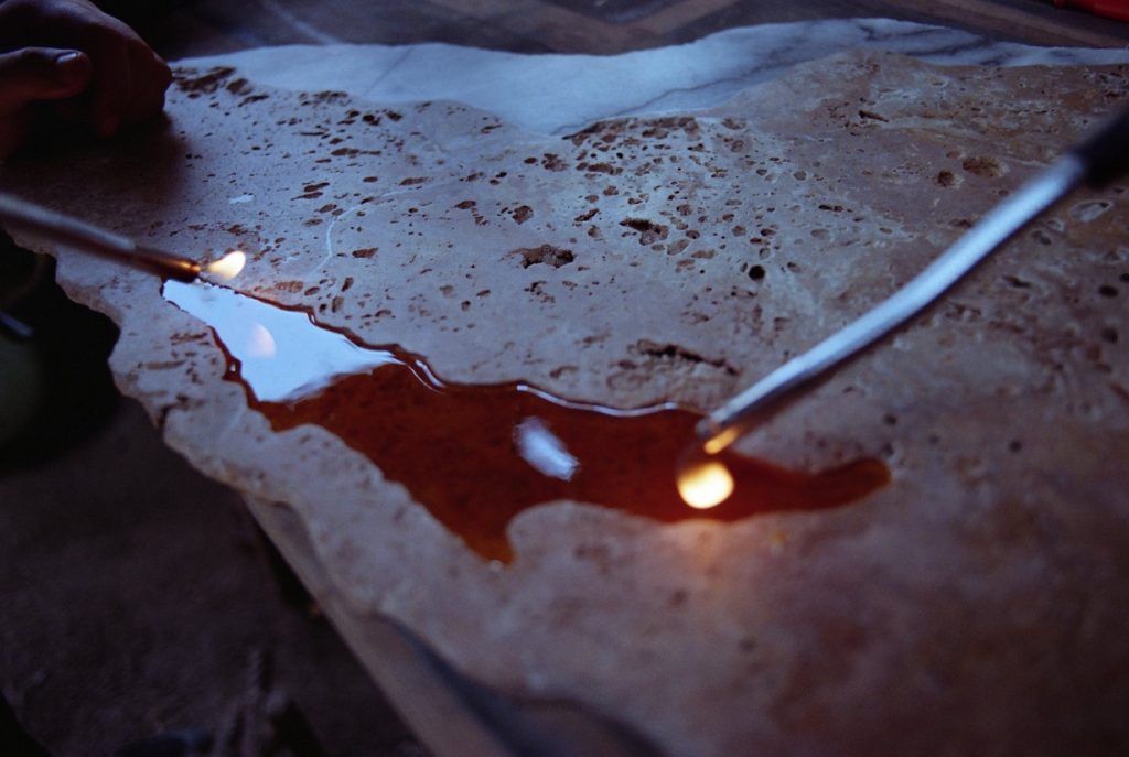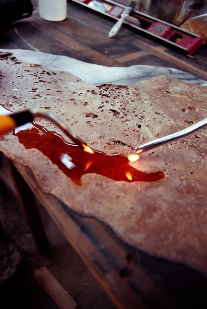 To stabilize the resin, the studio blends colophony with beeswax and carnauba wax. The resulting substance achieves a controlled viscosity similar to honey, allowing it to flow slowly before hardening. The molten mixture is poured onto a preheated onyx slab, where heat removes air bubbles and produces a continuous surface.