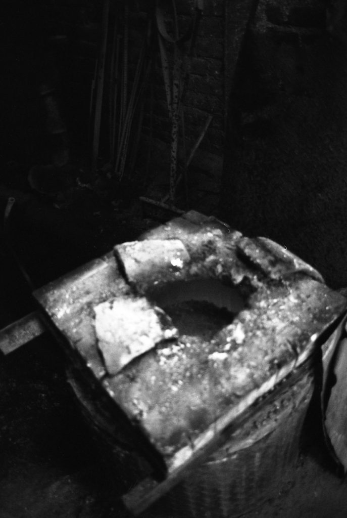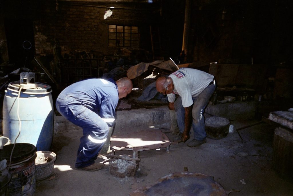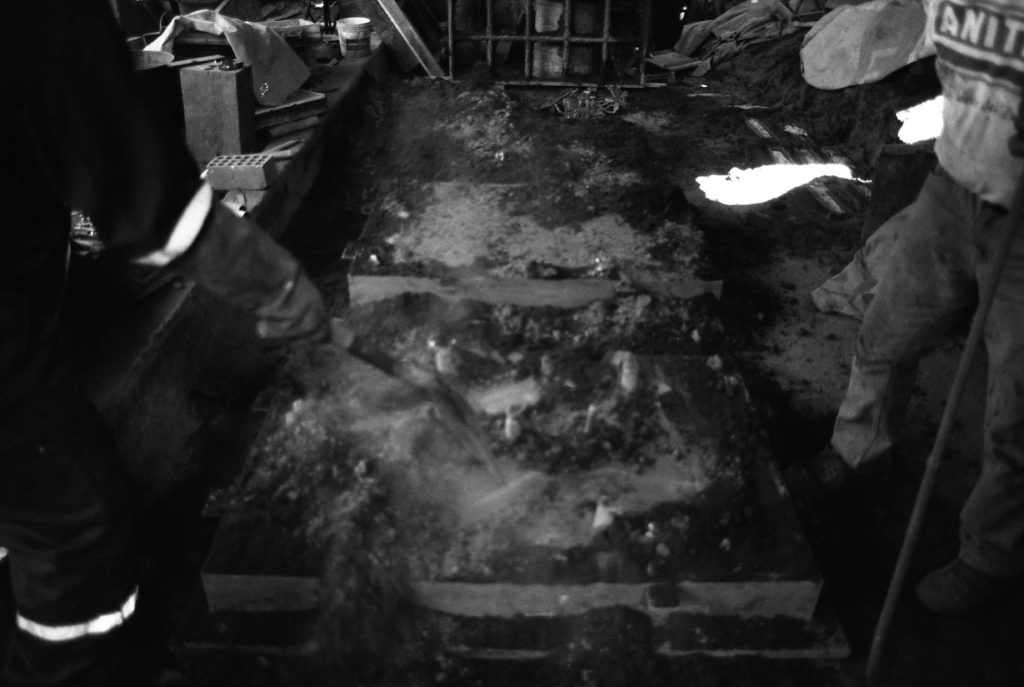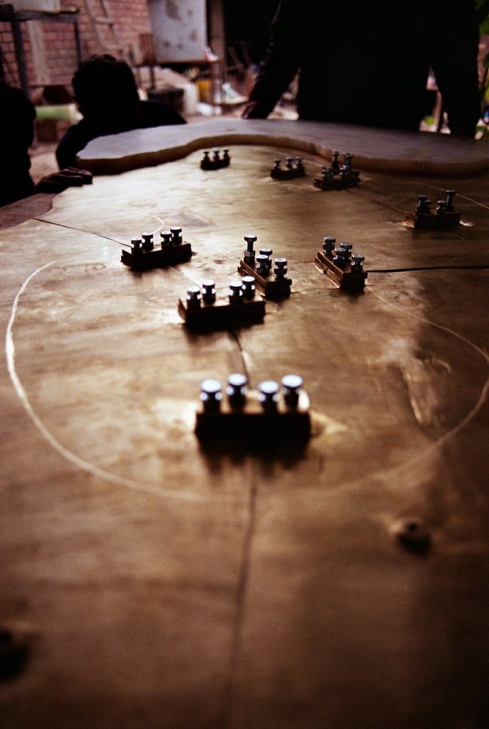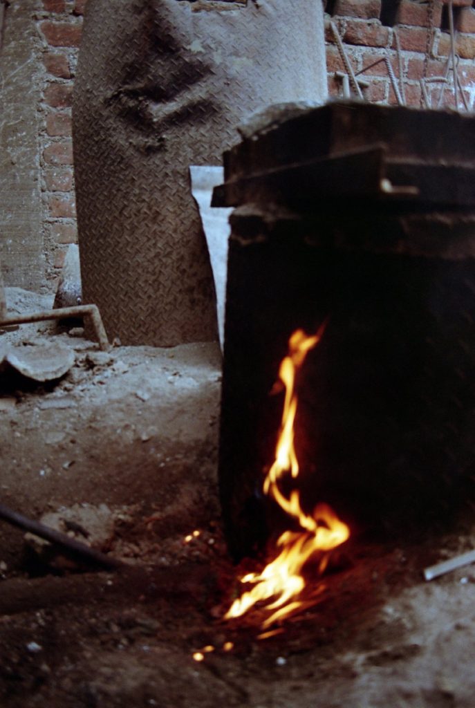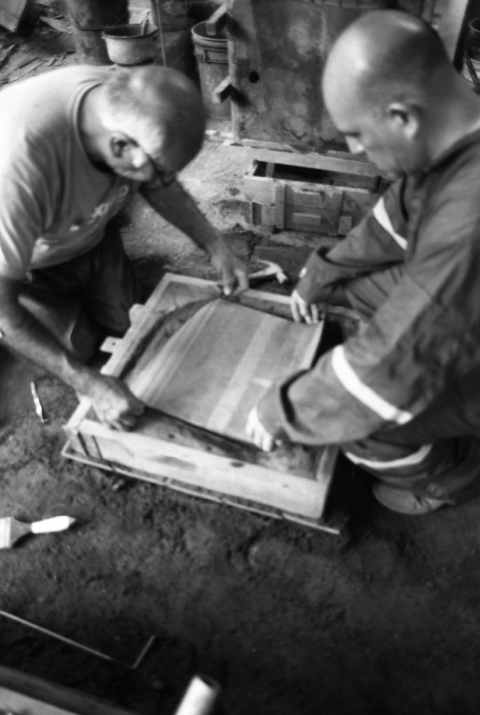 Material research forms the core of the project. The metal structure is produced from reclaimed bronze and recycled alloys melted and reformed through a controlled casting process. The molten metal is guided into sand-filled molds, allowing the flow of the material itself to determine the final surface texture. Once solidified, the bronze retains traces of its movement, making the casting process visible in the finished object.