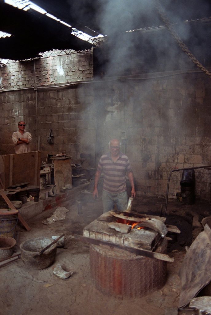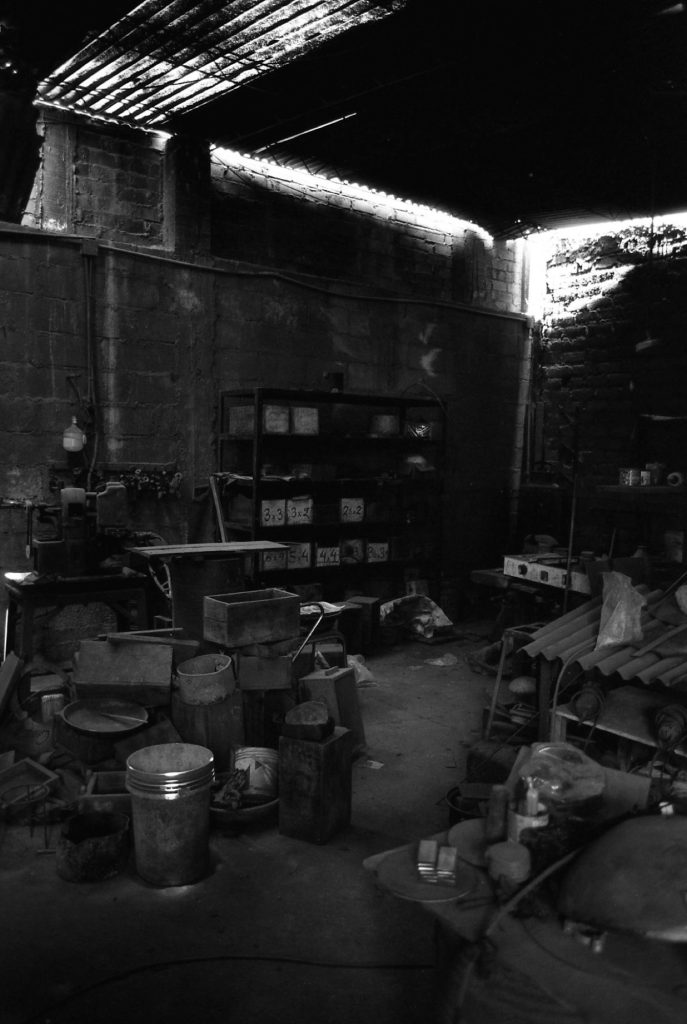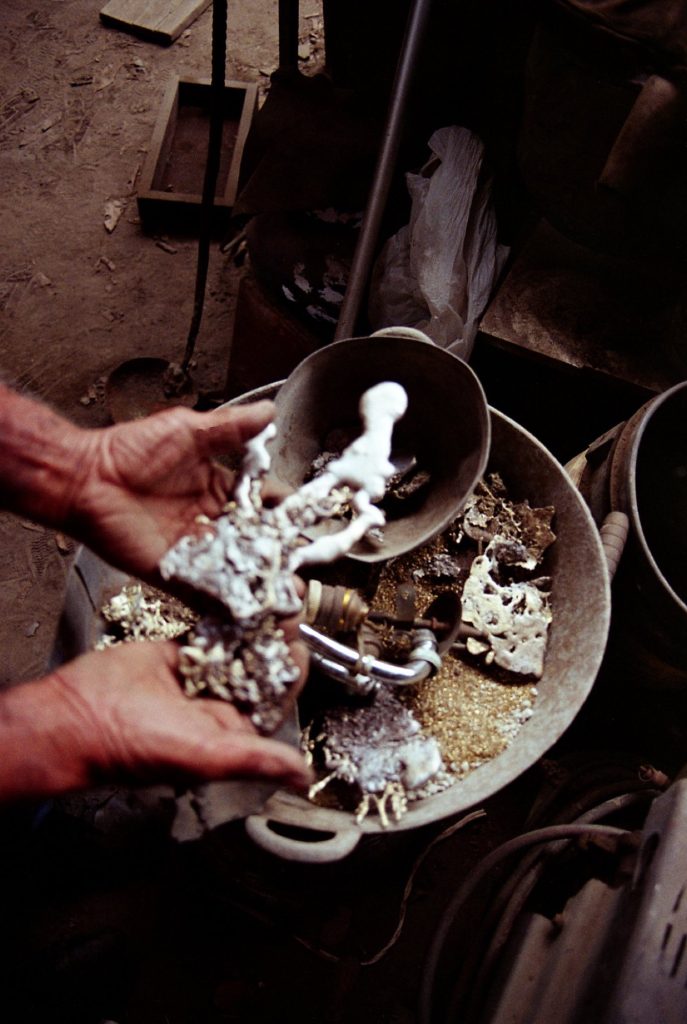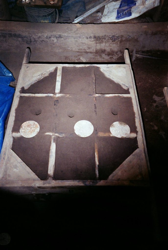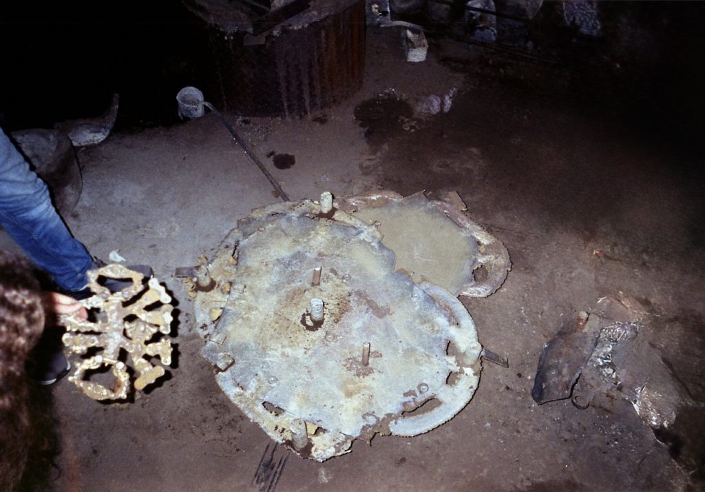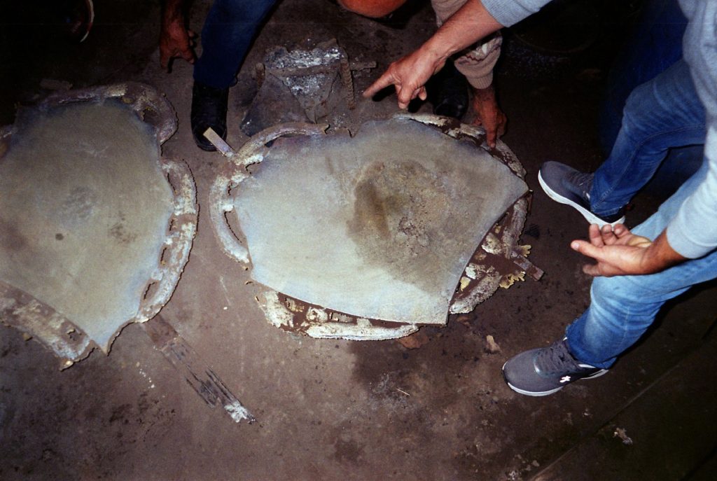 Material research forms the core of the project. The metal structure is produced from reclaimed bronze and recycled alloys melted and reformed through a controlled casting process. The molten metal is guided into sand-filled molds, allowing the flow of the material itself to determine the final surface texture. Once solidified, the bronze retains traces of its movement, making the casting process visible in the finished object.
