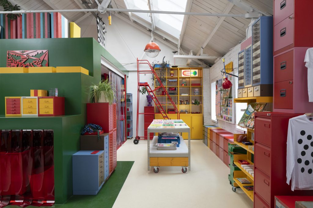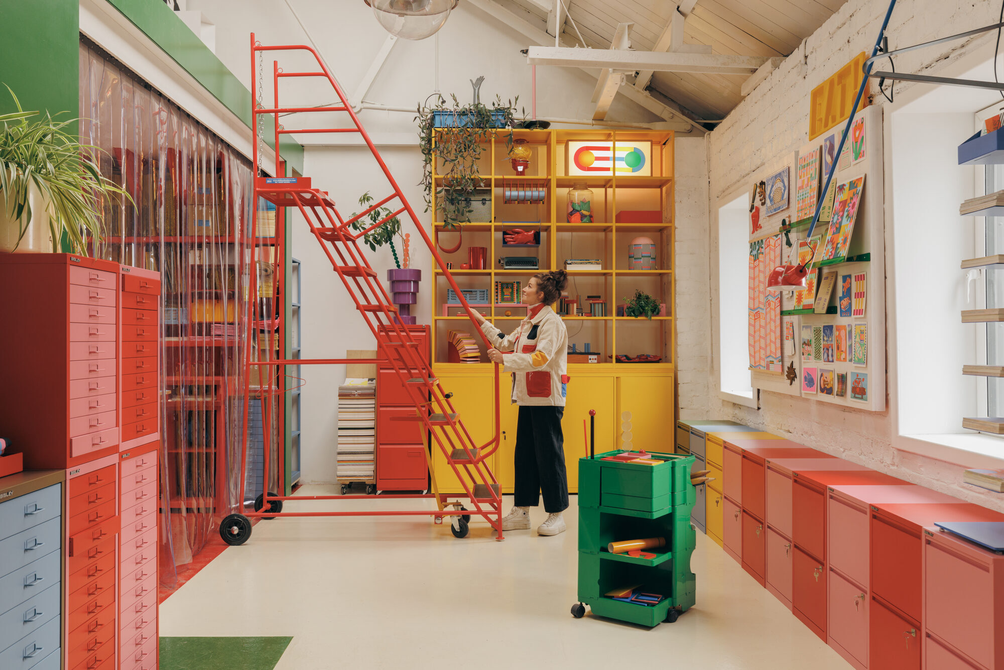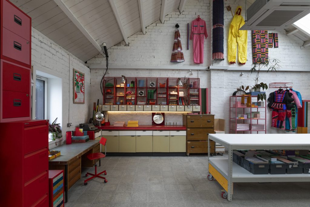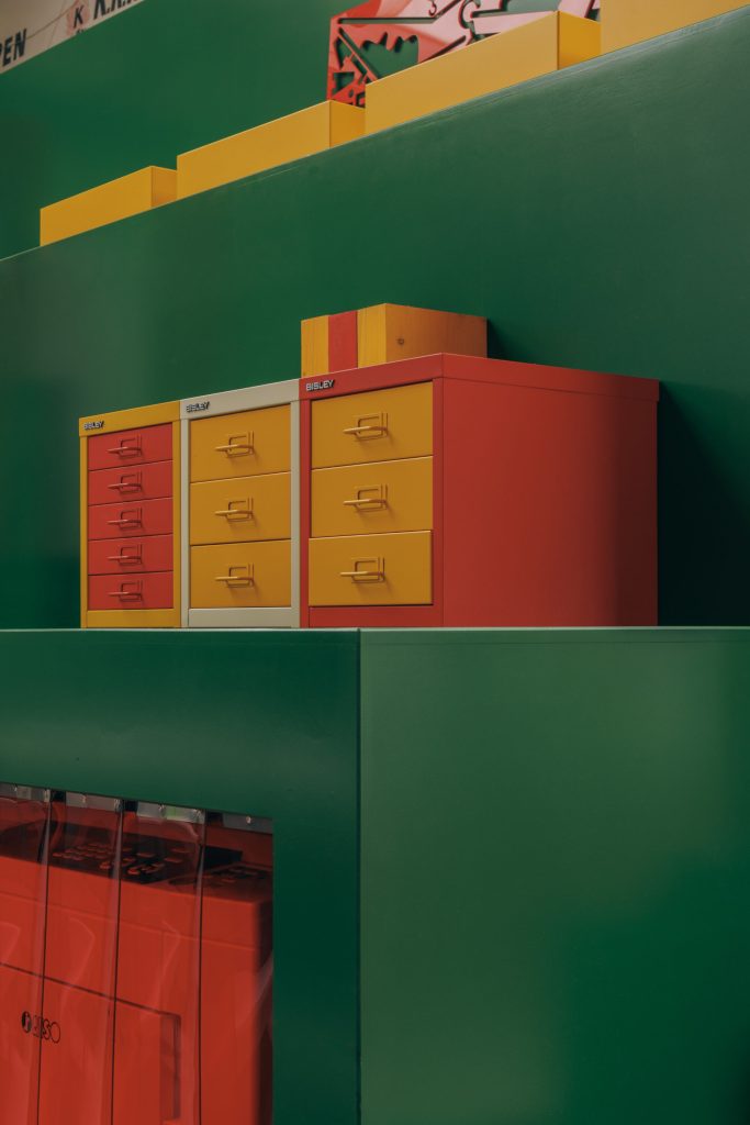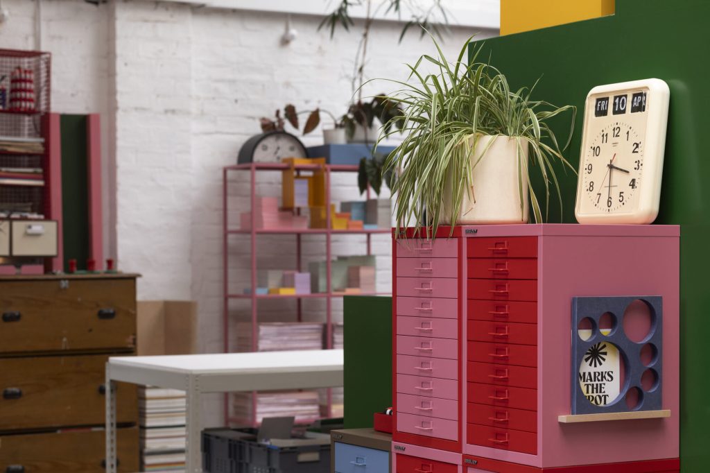 Material and furniture systems play a central role in defining the space. In collaboration with British manufacturer Bisley, the studio incorporates a curated selection of steel storage units, including MultiDrawer, Outline, and LateralFile systems, alongside classic filing cabinets and card filers.