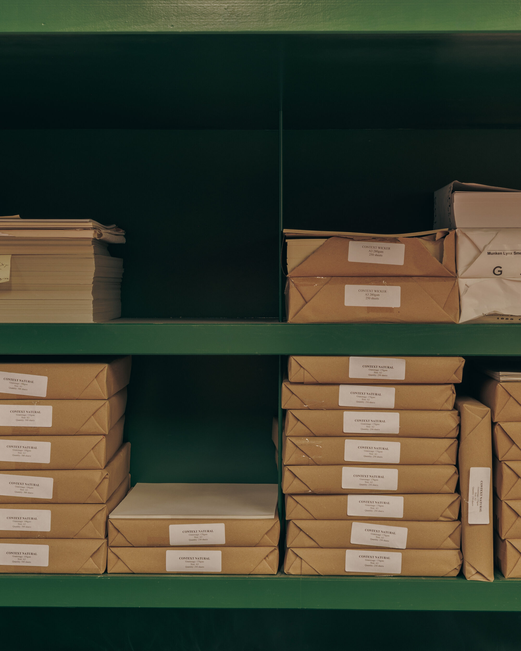 The studio is anchored by the Green Room, a custom-built structure by furniture maker Alexander Garthwaite conceived as a stepped volume rather than a conventional enclosed box. Designed to reclaim underused space, it absorbs residual interior volume while projecting outward as a series of oversized platforms that double as display surfaces for Marcella’s sculptural works. Within, the negative space is precisely calibrated into cantilevered shelving systems, accommodating paper stock and print materials with efficiency, while keeping the main workshop open, flexible, and in constant motion.