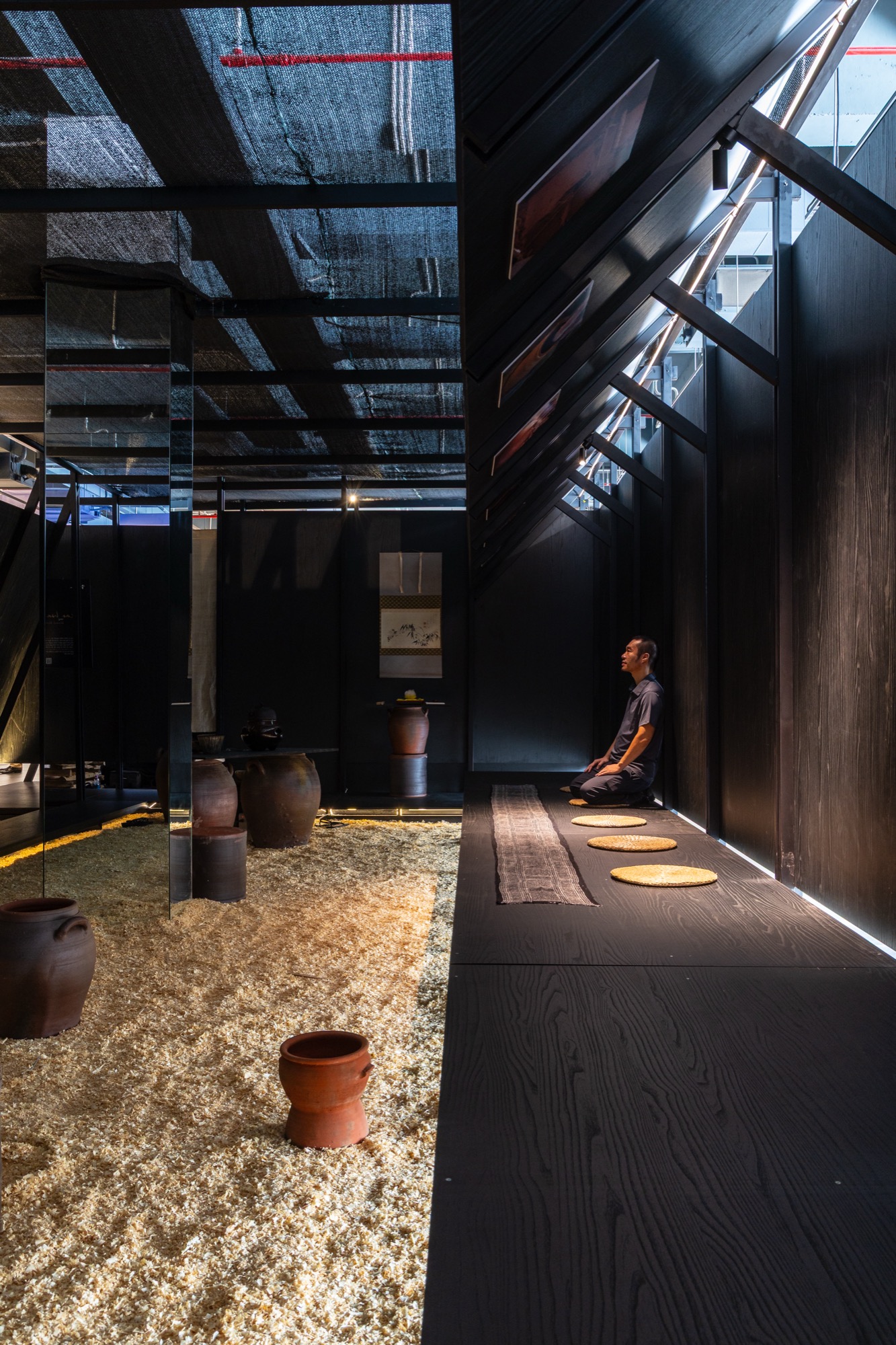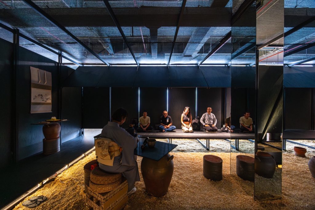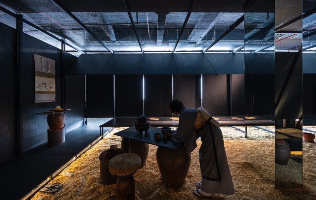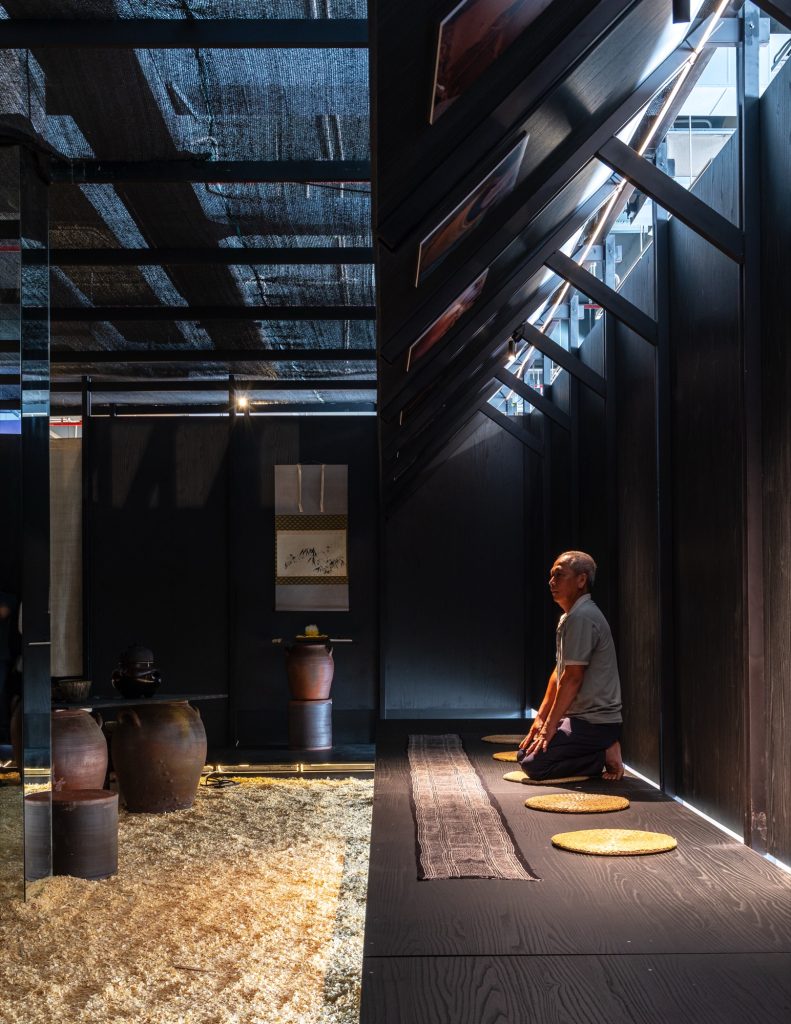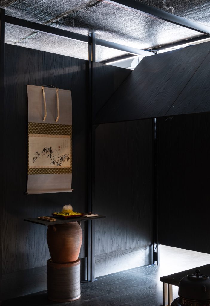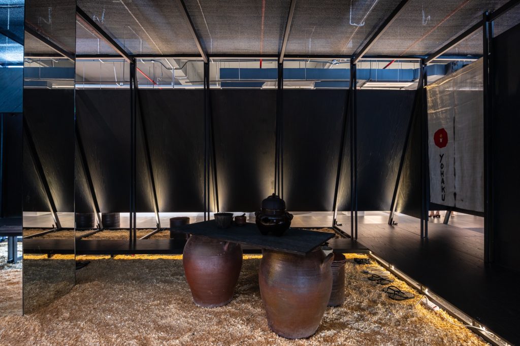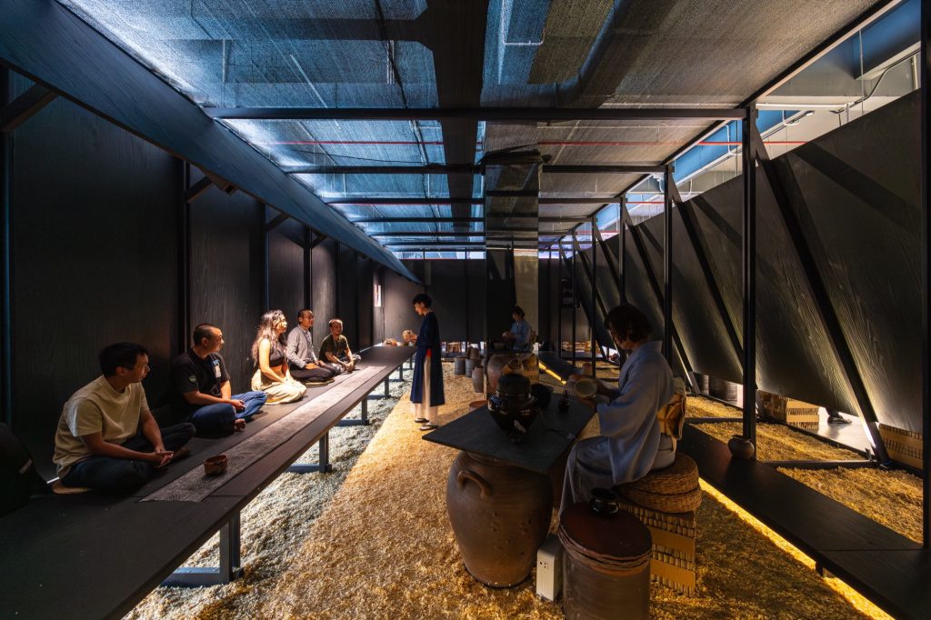Nguyen Hong Quang: Black is employed as a visual backdrop, causing the spatial structure to recede and allowing light, ceramics, and the gestures of the tea ceremony to become the primary elements guiding the experience.