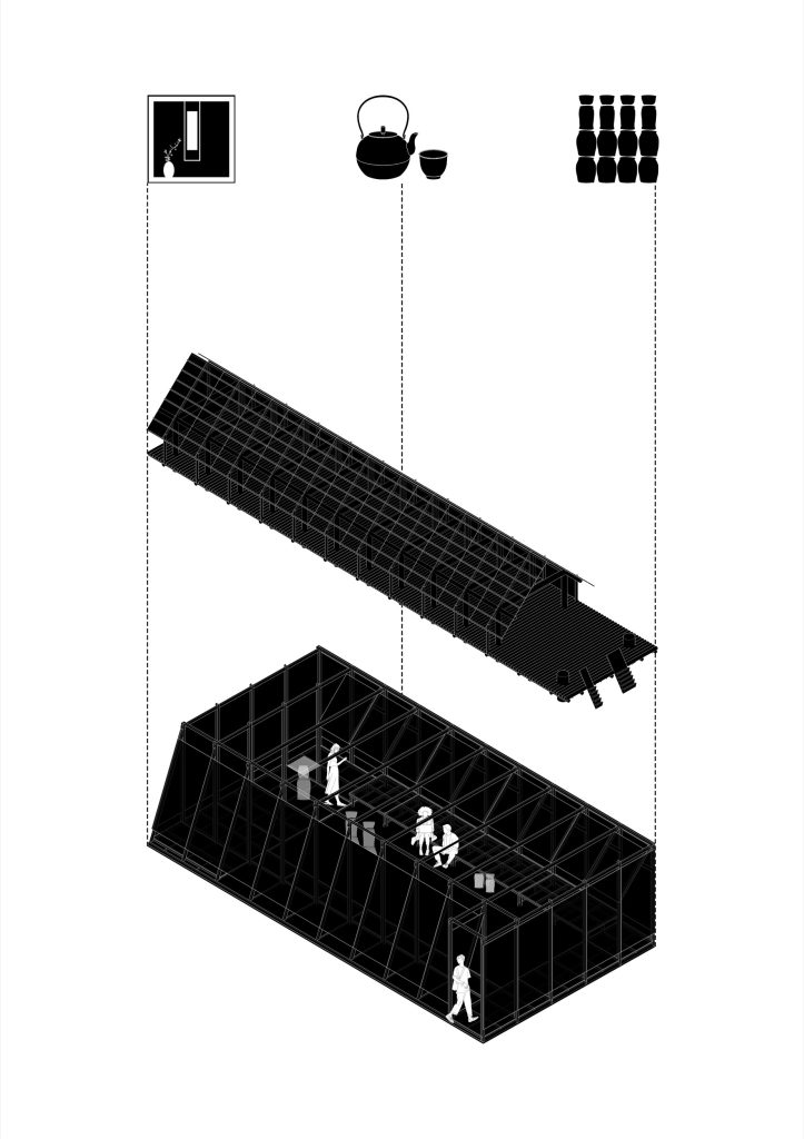 On this basis, the Pavilion takes its point of departure from the Vietnamese ethnice Ede longhouse, a vernacular architectural typology of Vietnam that functions not merely as a place of dwelling but as a spatial structure for social rituals, where communal life, customs, and collective memory are tightly interwoven. From this form, the project poses a question of cultural dialogue: whether the Japanese tea ceremony, with its emphasis on stillness, restraint, and heightened concentration, can be practiced within a structure that evokes Vietnam’s traditional ritual spaces.