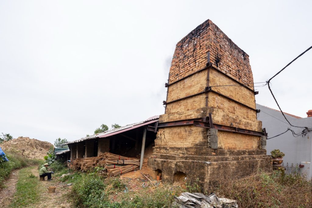 Nguyen Hong Quang: The Phu Lang kiln embodies architectural characteristics that are distinctly Vietnamese, from materiality to formal expression, and is closely associated with traditional wood-firing techniques sustained across generations. The kiln is typically embedded into the terrain or constructed with a deliberate incline, enabling the upward propulsion of heat and flame during the firing process. Its elongated body is subdivided into multiple consecutive chambers, commonly ranging from five to ten, forming a linear configuration that, when viewed from a distance, recalls the image of a reclining dragon. The kiln vault is constructed as a shell-like curved enclosure using refractory bricks, allowing heat to be evenly distributed and efficiently retained.