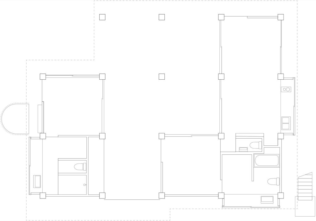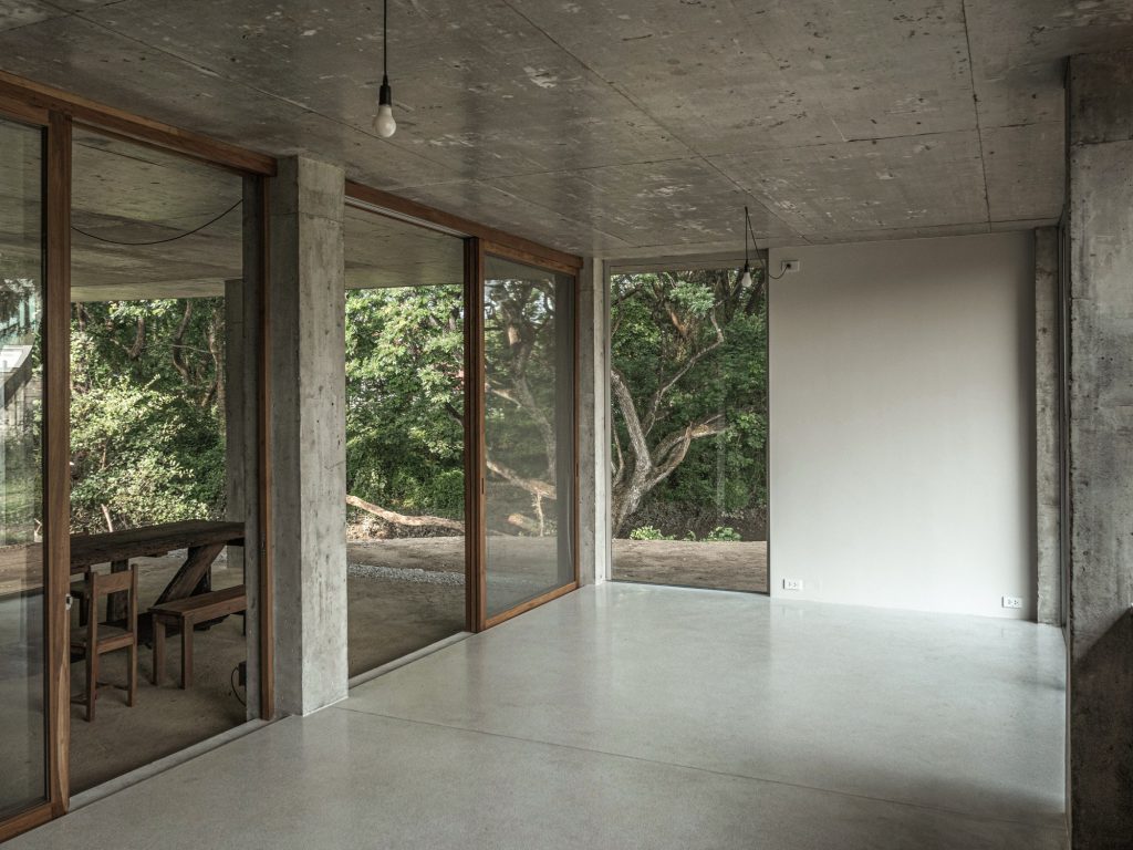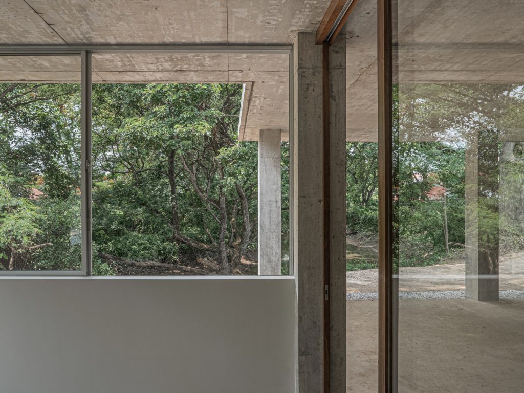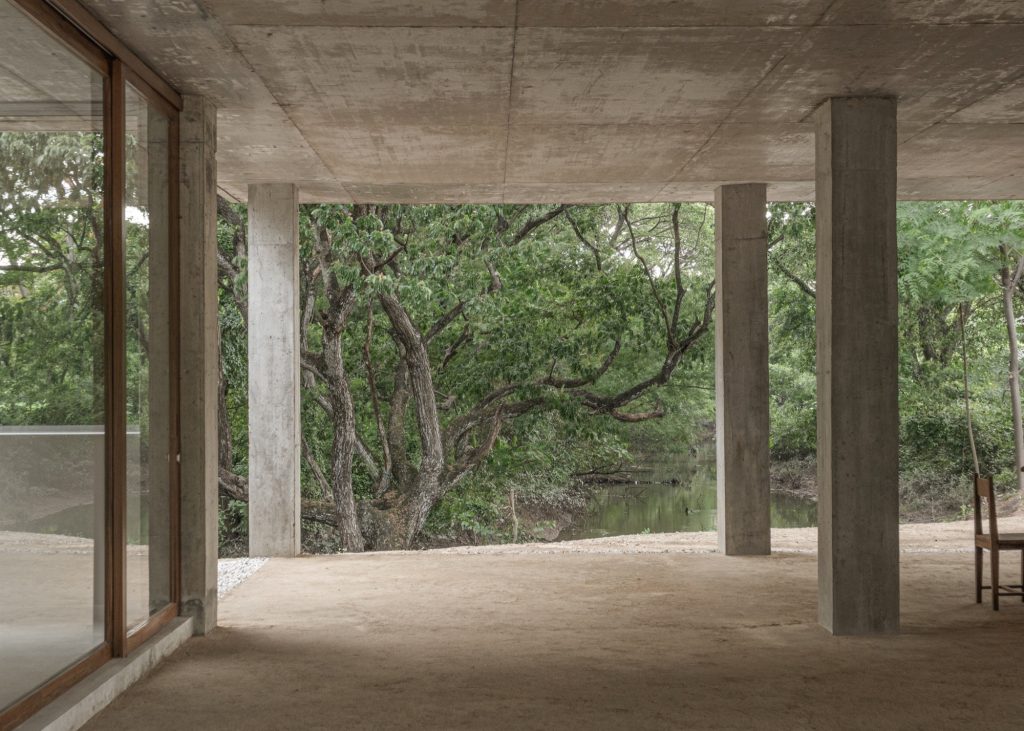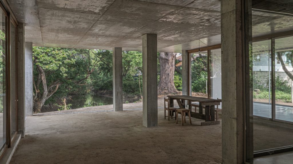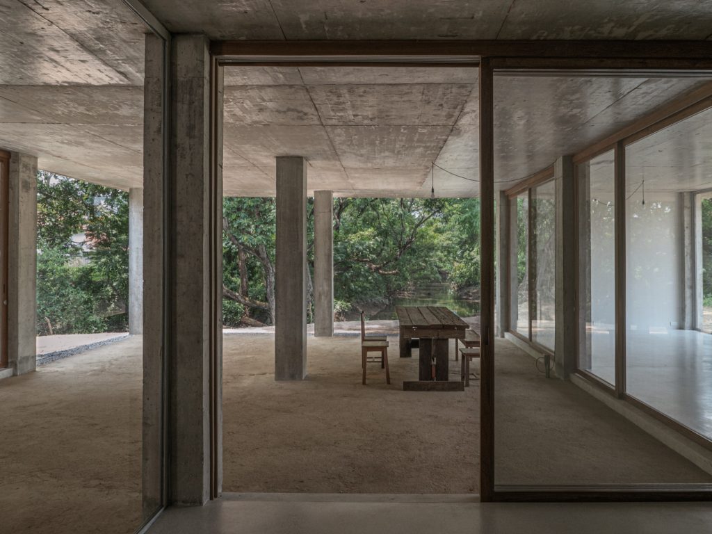 Nestled beside a quiet river in a residential enclave, this house is shaped by two conditions: dense planting and a wide western view toward the river’s bend, with a road pressing close on the east. From the street it reads as a restrained box, almost anonymous, defined by a single concrete roof slab held on a rigorous grid of columns. The grid does not dramatize the plan. It simply sets a calm order, allowing rooms to be divided and recombined with ease.