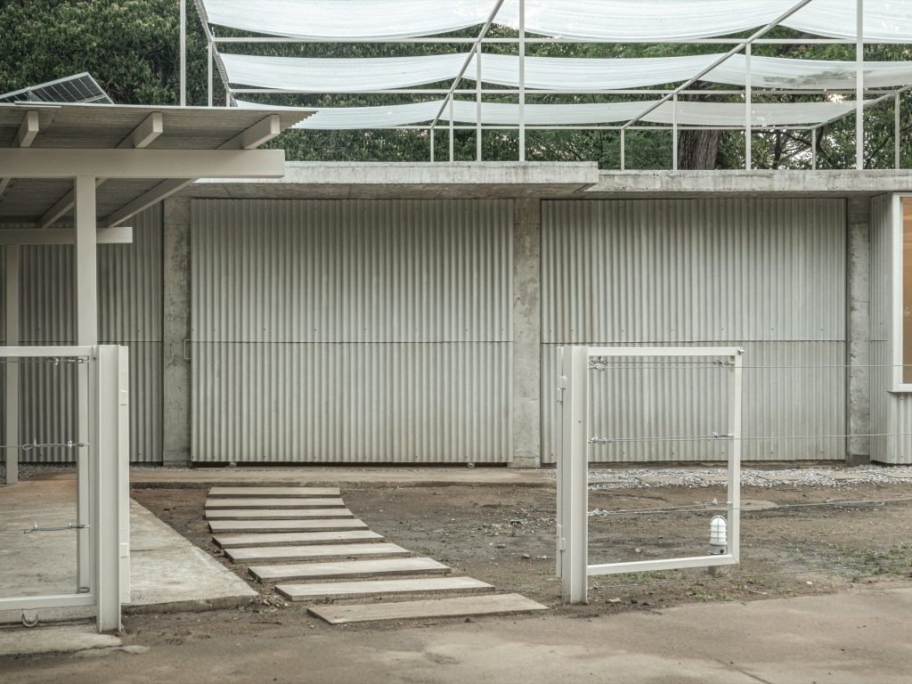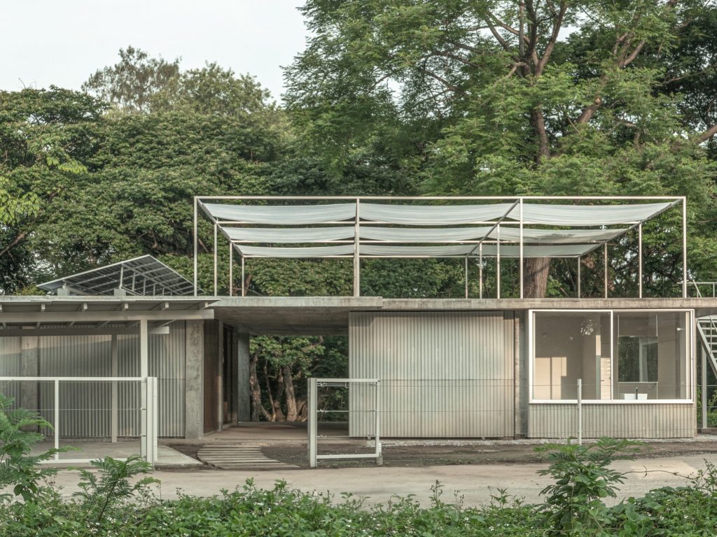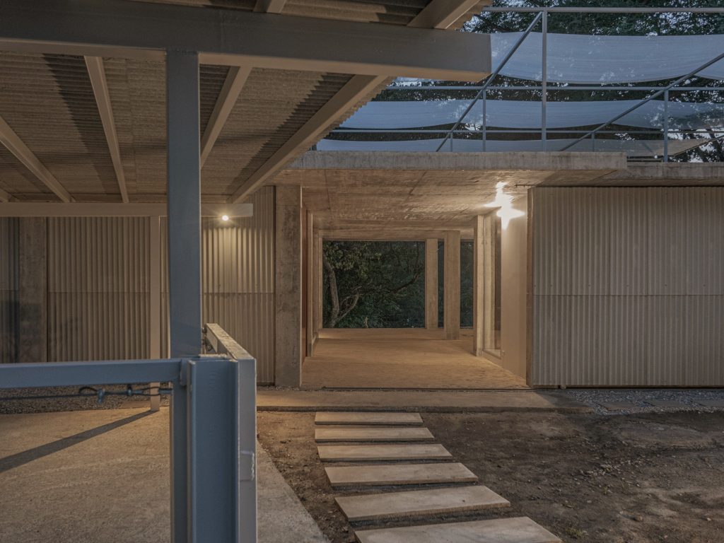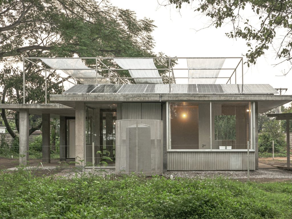 At the core, a porous earthen floor accepts gentle seepage and supports a cooler interior through airflow, turning humidity, wind, and shade into working elements of comfort. Above, the roof operates as a climatic buffer rather than a cap. Solar panels contribute energy, a steel frame carries adjustable sun shading fabric, and ventilated floor blocks reduce direct heat while sustaining cross ventilation. The house reads less as a finished form than as a small ecosystem, where earth, plants, rain, creatures, and humans share one adaptable framework.