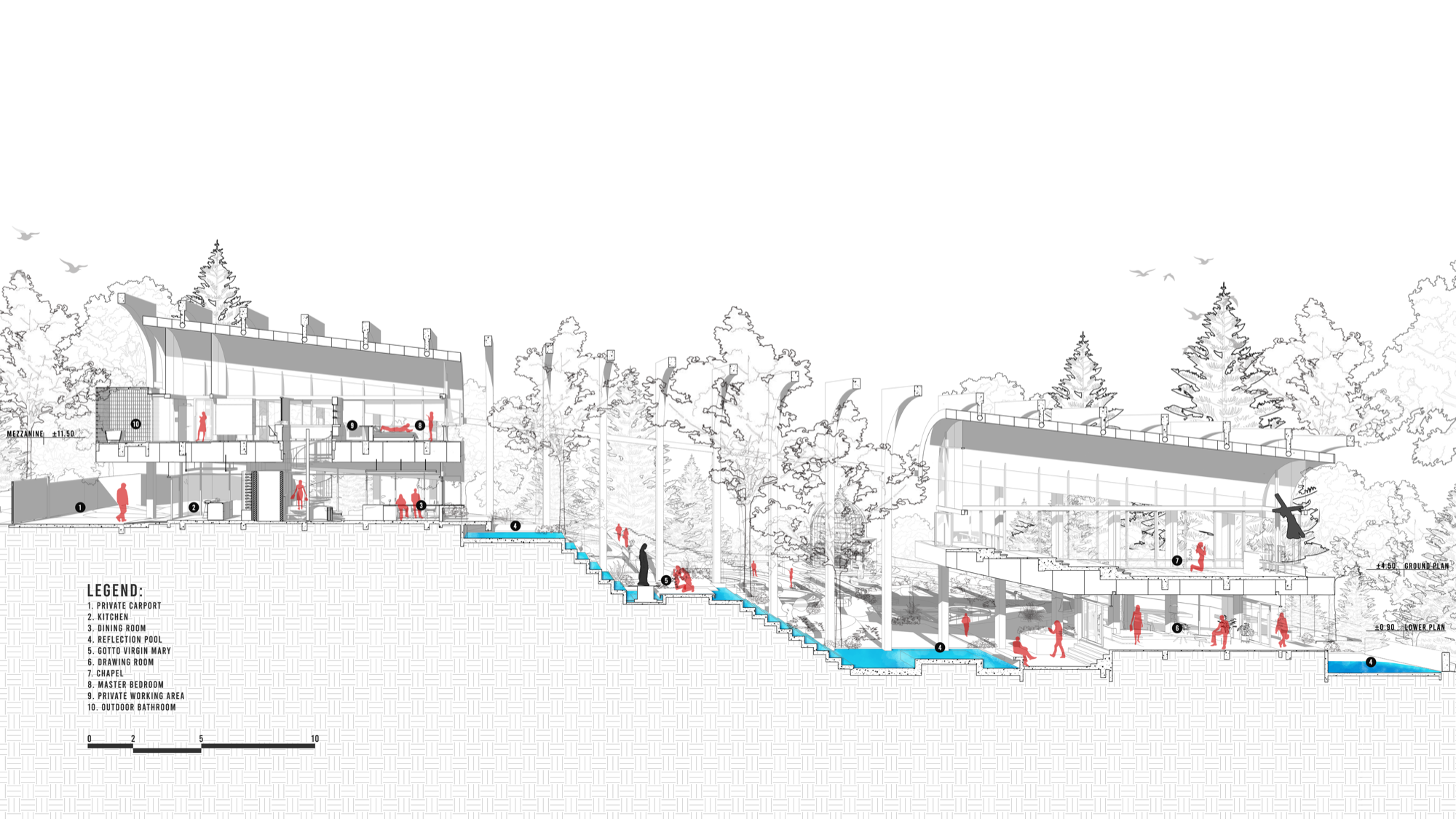 The organization of the site into three interrelated zones establishes a gradual spectrum of privacy and accessibility rather than rigid separation. The semi public chapel, the Mother Mary spiritual garden, and the private retreat are connected through continuous landscape and architectural elements, allowing movement between them to feel intuitive and fluid.