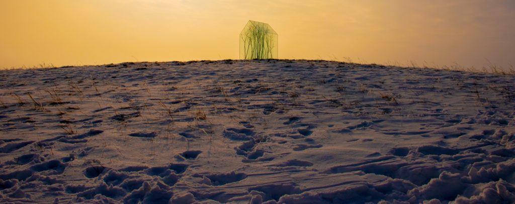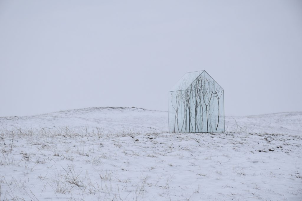 It Will Never Snow Again is a glass installation depicting a house-like structure whose interior is divided into equally sized cells. Within these cells, fallen and collected tree branches are placed separately, isolated from one another. The elements do not form a unified, functioning system; they appear instead as individual fragments.