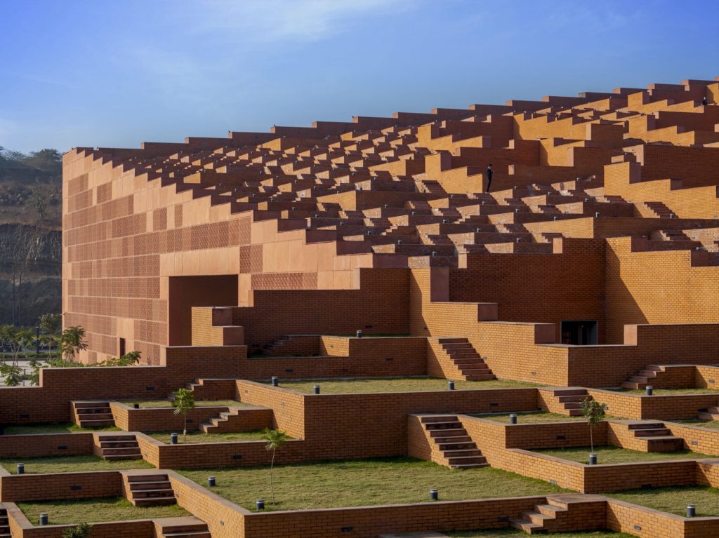 The terraced form recalls the geometry of historic Indian stepwells, civic structures that for over a millennium have combined water storage with social congregation. Here, that precedent is abstracted into 463 stepped platforms forming a 9,000 square metre rooftop garden. The terraces accommodate simultaneous activities at different scales, from informal gatherings to large events seating up to 9,000 students.
