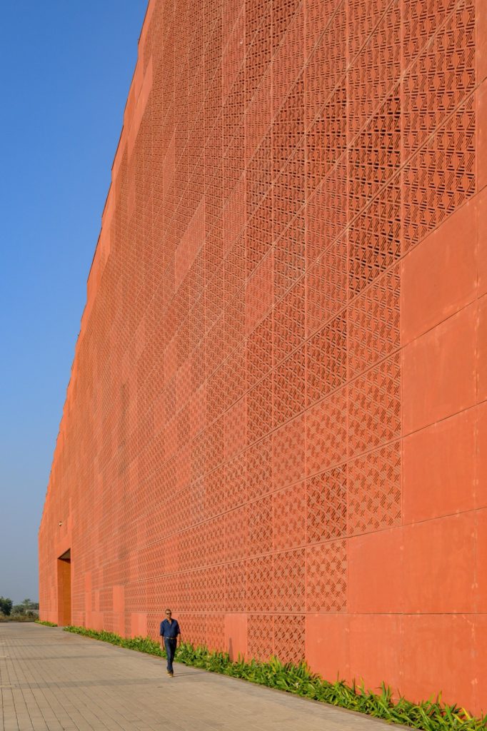 The east, west, and southern facades are wrapped in ventilated GFRC screens that temper solar gain. This porous envelope, combined with shaded courts and stepped terraces, reduces dependence on artificial lighting and mechanical cooling. The result is an energy efficient structure that draws from principles embedded in traditional Indian architecture while employing contemporary materials and construction techniques.