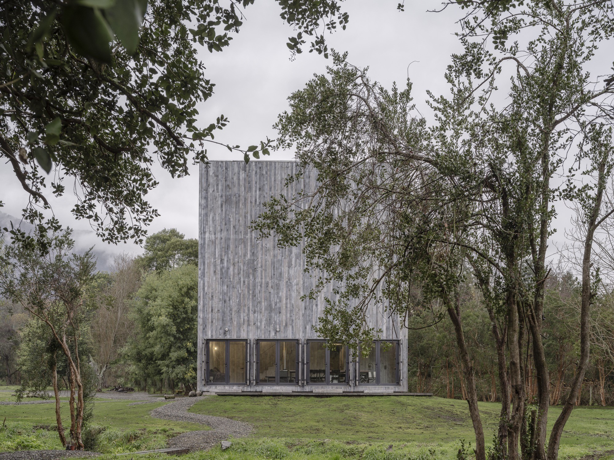 Humo House in southern Chile reshapes an 11-metre cube into a split-volume home balancing openness and shelter, with timber slat cladding, triple-height public space, and a larch-trunk table that merges kitchen and dining.