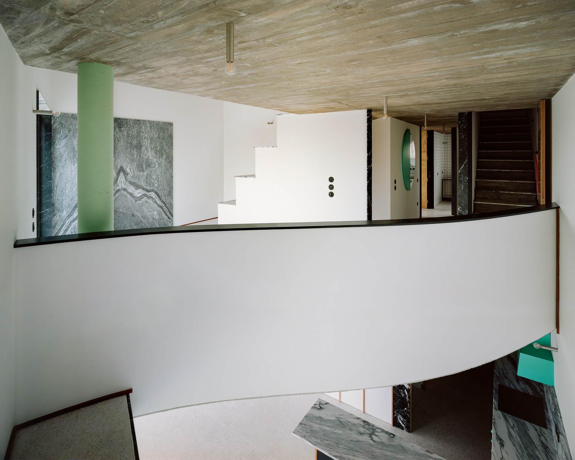 This experimental suburban house disrupts the traditional pitched roof through curved geometry, playful colours and sculptural interior columns.