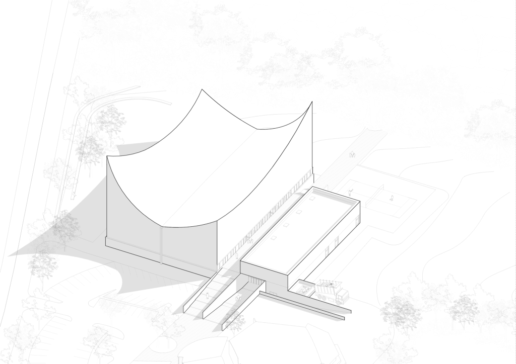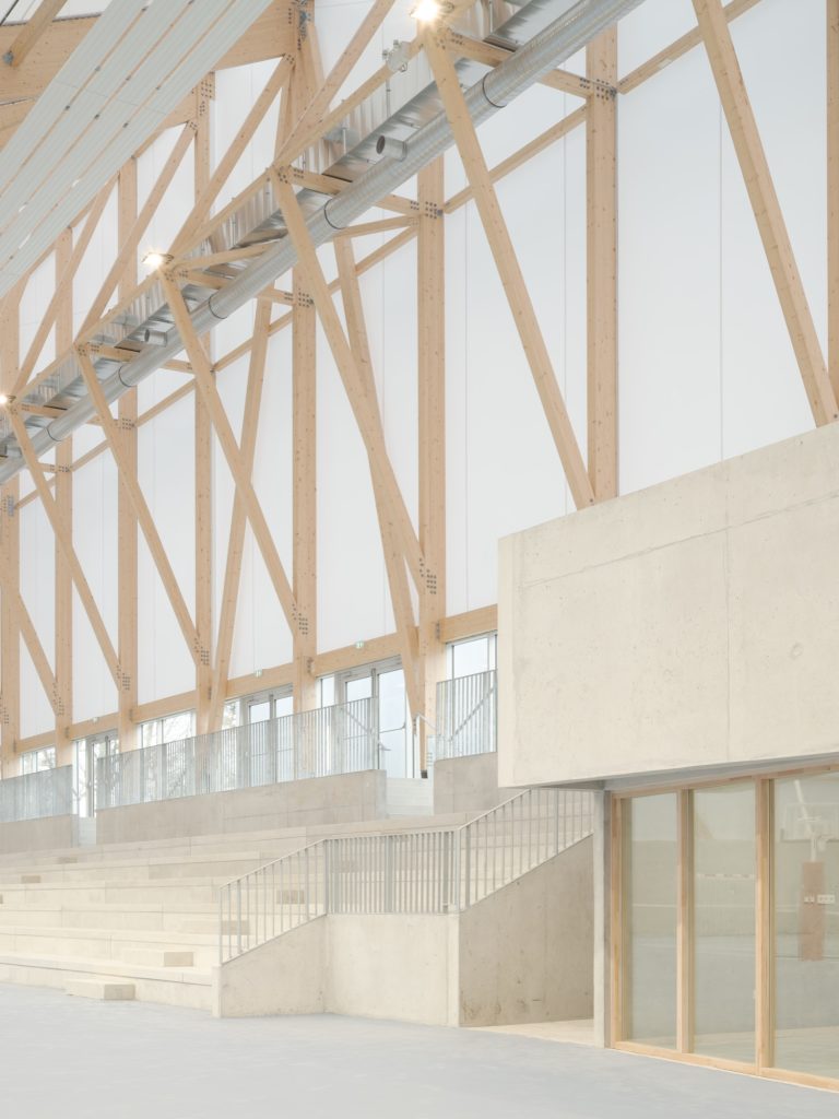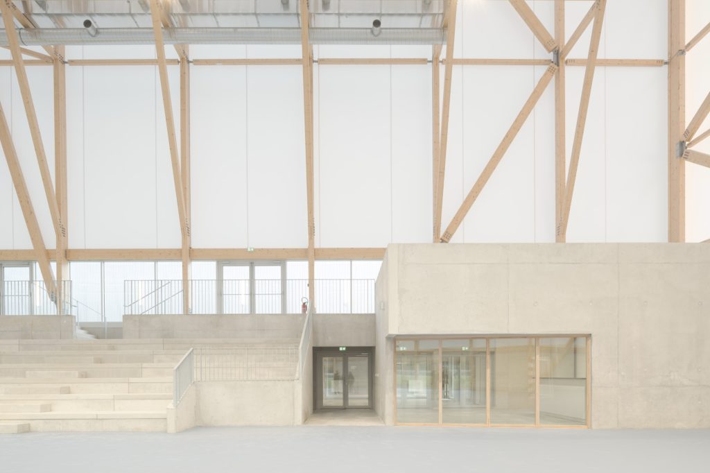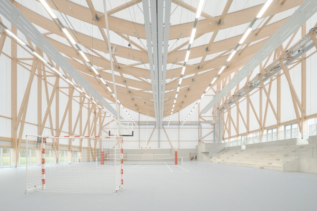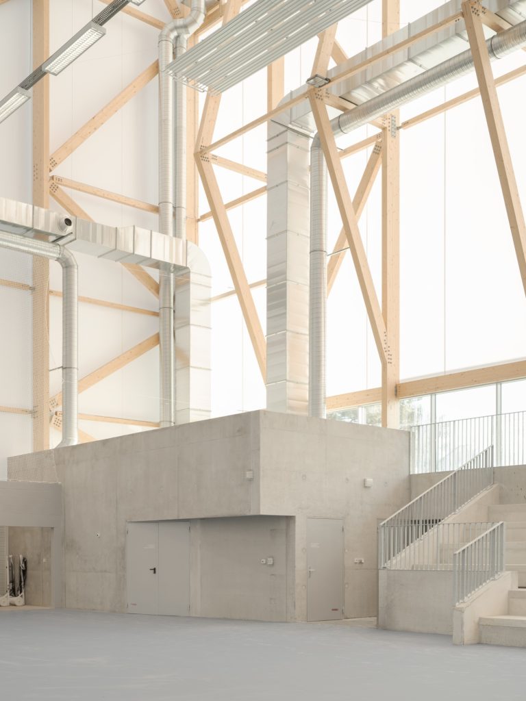 In contrast, the sports hall is conceived as a lighter, unheated pavilion. Covered by a white textile membrane stretched across four inverted points, its geometry promotes natural ventilation and passive cooling during summer months. The membrane roof gives the hall an ephemeral quality, reducing its visual weight while ensuring the scale necessary for competition.