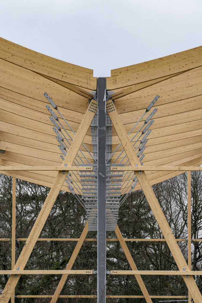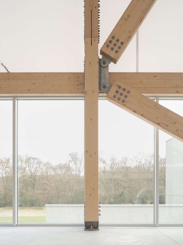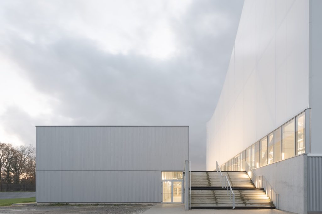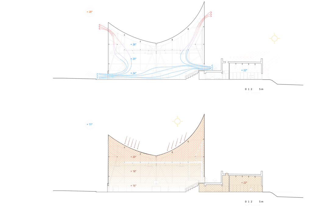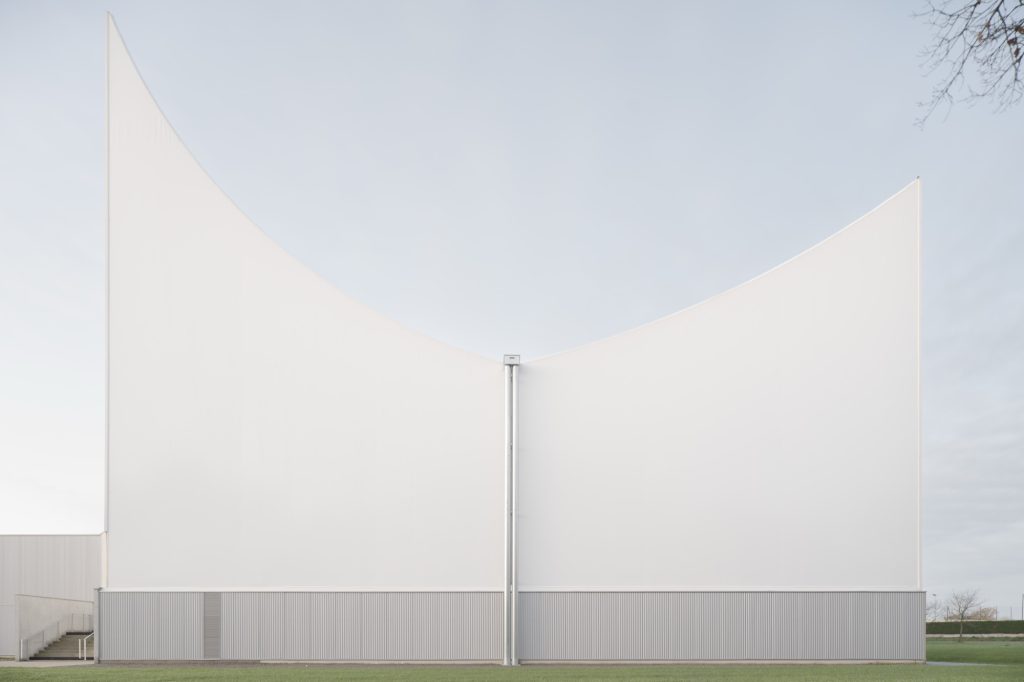 In contrast, the sports hall is conceived as a lighter, unheated pavilion. Covered by a white textile membrane stretched across four inverted points, its geometry promotes natural ventilation and passive cooling during summer months. The membrane roof gives the hall an ephemeral quality, reducing its visual weight while ensuring the scale necessary for competition.