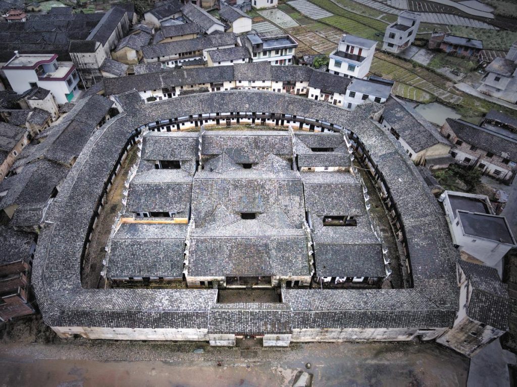 Panoramic view of a Hakka walled complex in Longnan, Jiangxi, in its mountainous frontier setting. Credit: China Story