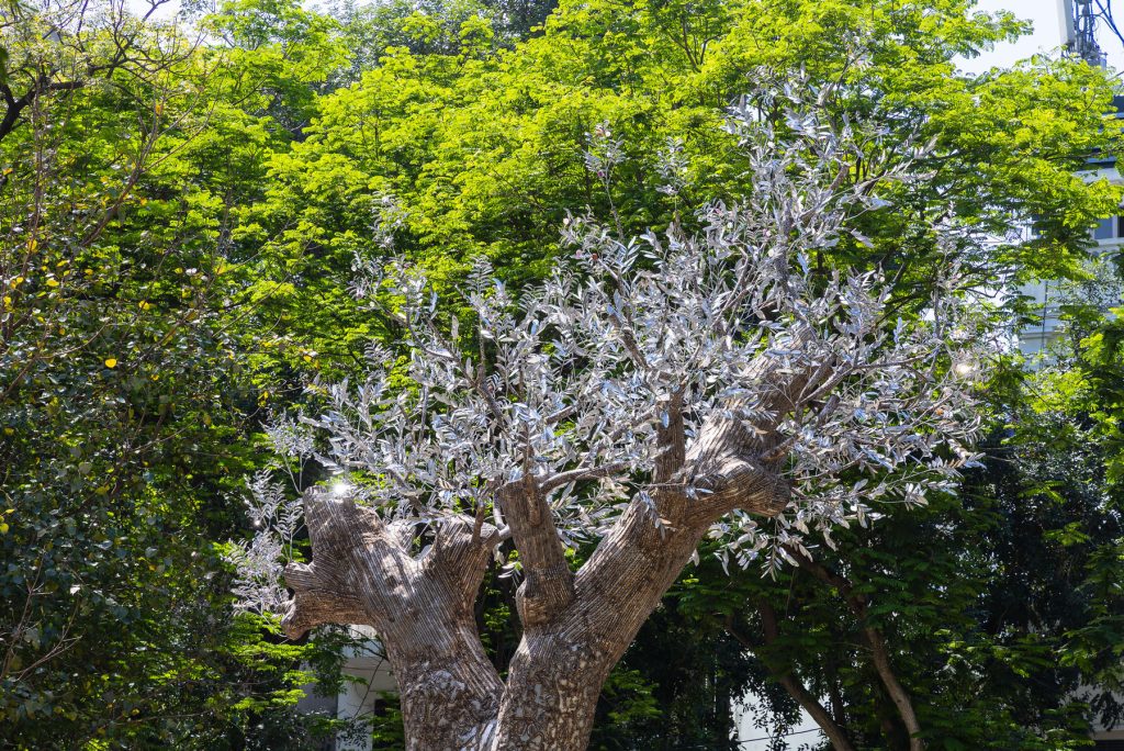 Steel carries a strong masculine quality. It is rigid and forged through force. Yet through shaping and labour, it becomes shimmering, soft, and patient, embodying a feminine presence. I chose quartz for its healing energy. When sunlight touches the surface, steel reflects while stone absorbs and glows. The xà cừ tree seems to breathe again. By placing artificial material such as stainless steel alongside natural quartz, I wanted to create a dialogue.