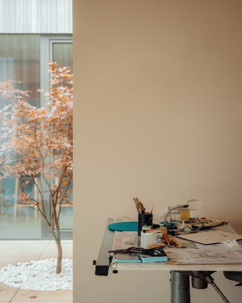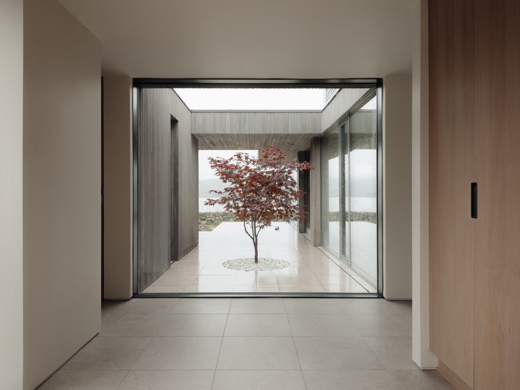 At the core of the plan is a three sided courtyard, organised around a single acer Fireglow tree. This sheltered outdoor room acts as both hinge and threshold, subtly separating the main living spaces from an artist’s studio while maintaining visual and spatial continuity. The studio culminates in a glazed corner overlooking the water, a moment that captures the studio’s client focused ethos. Here, seclusion and openness coexist, offering a contemplative workspace that remains connected to the broader social life of the house.