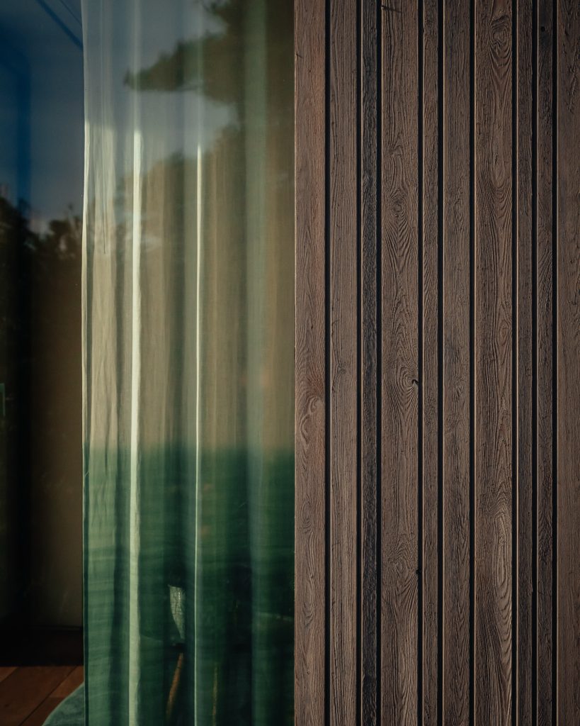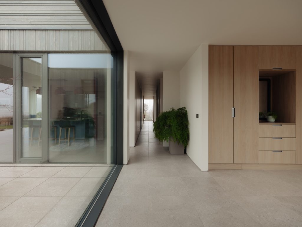 The house is carefully calibrated to its setting between village and estuary. On its northern elevation, facing the settlement, a robust smoked clay brick facade anchors the building to the ground, lending it a sense of permanence and protection against prevailing winds. To the south, the architecture opens and lightens, with timber cladding that will weather gradually in response to salt air and changing seasons. This deliberate contrast establishes a dialogue between shelter and exposure, solidity and lightness, that runs throughout the project.