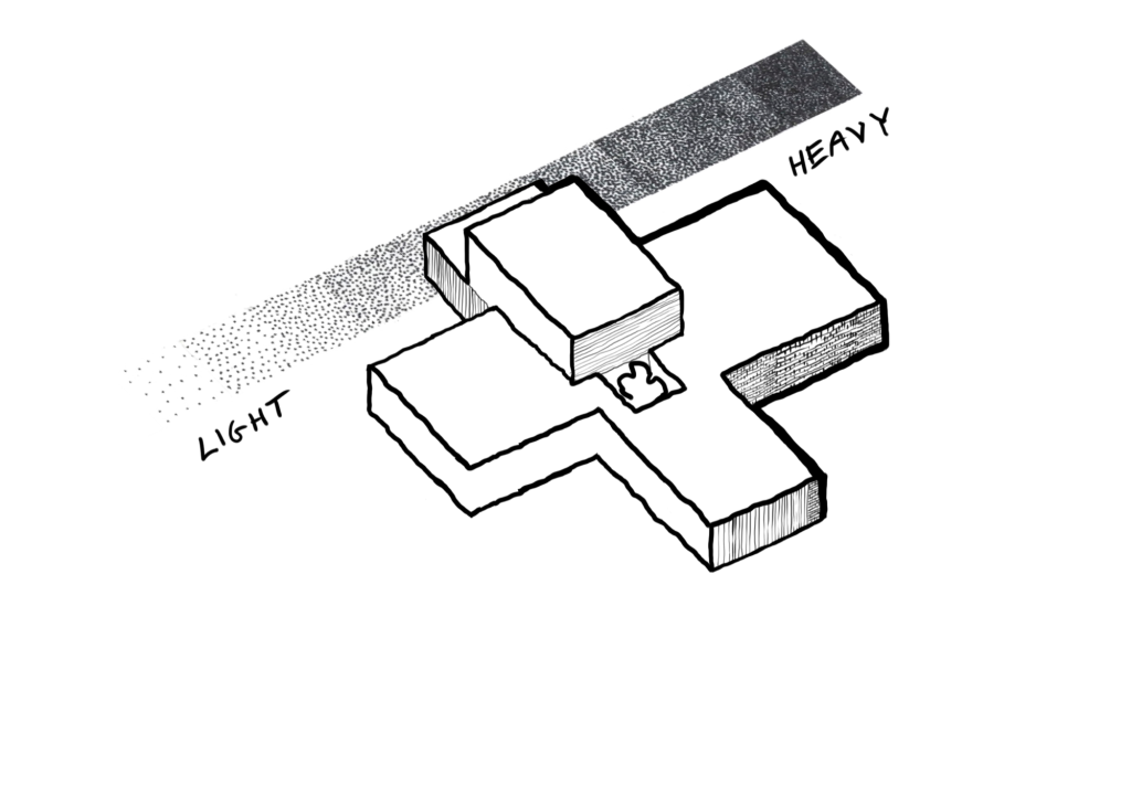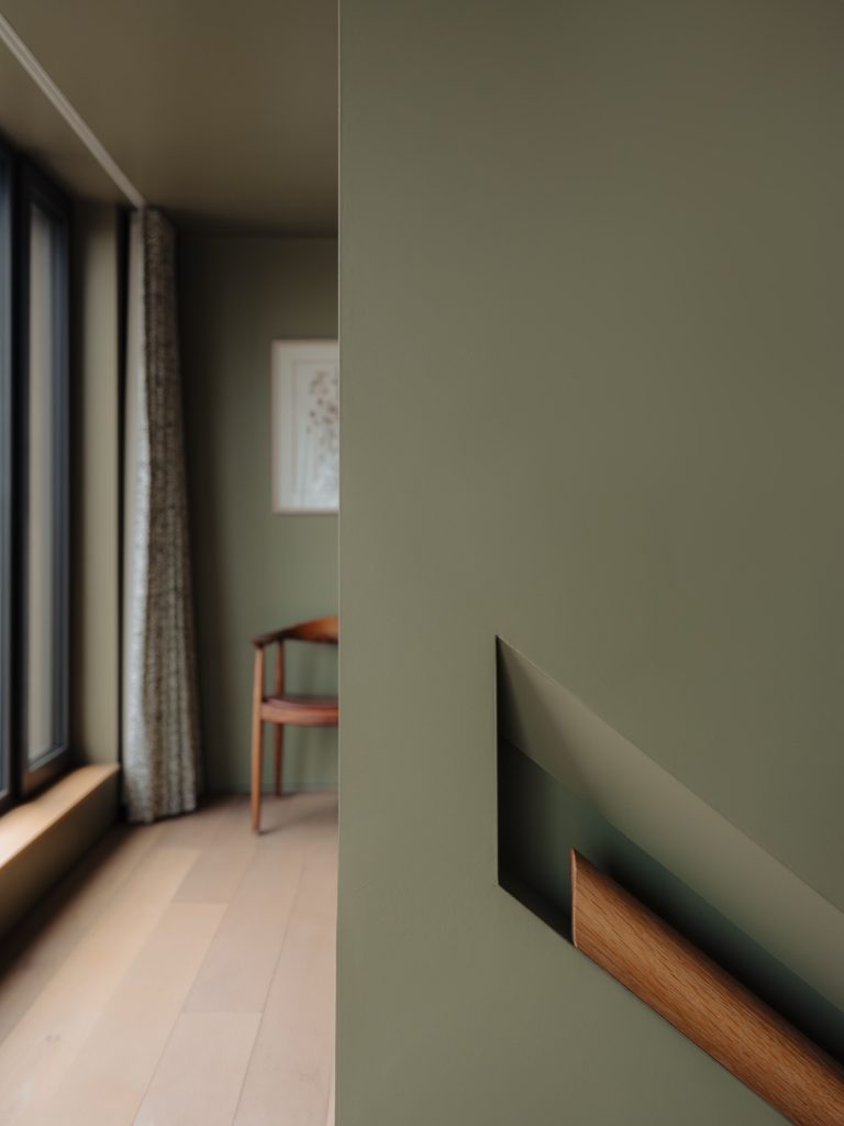 Environmental performance is embedded quietly within the architectural logic. Large south facing windows support passive solar gain, while the thick masonry wall to the north functions as a thermal store. An overhang provides seasonal shading, and carefully positioned openings enable natural cross ventilation. These strategies reflect the studio’s slow work philosophy, characterised by patience, precision, and a deep respect for material and craft rather than technological excess.