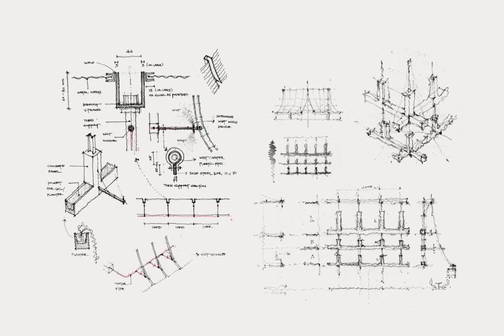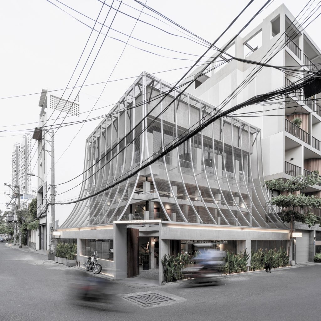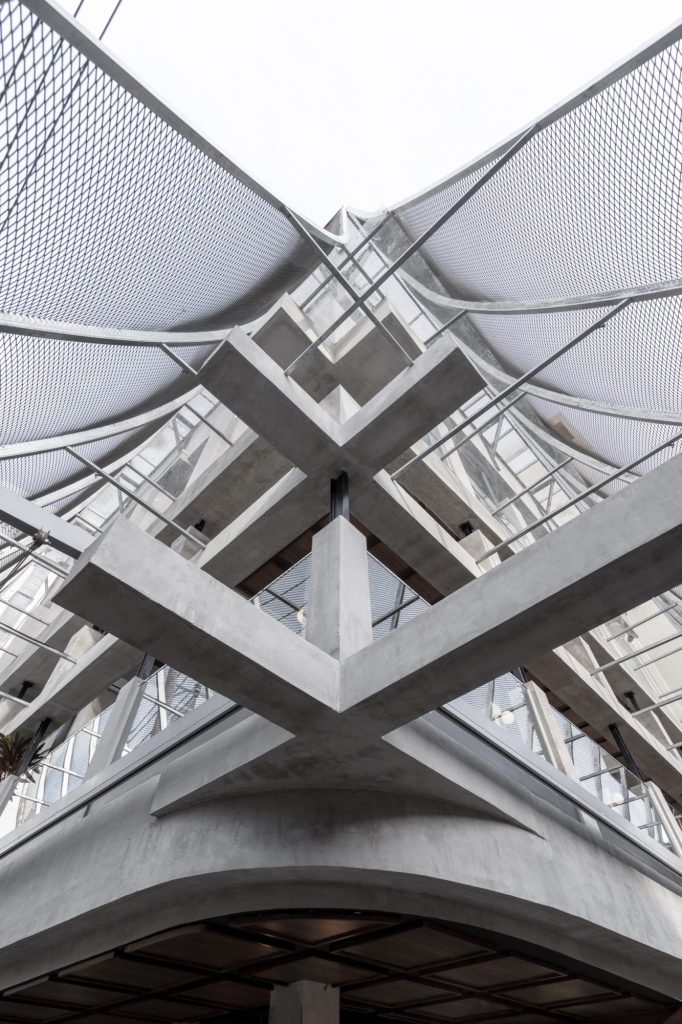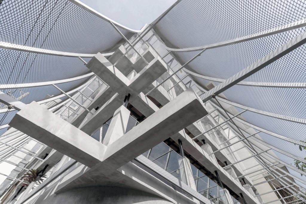 Beyond its visual register, the outer veil functions as an environmental device tuned to the tropics. Its perforated surface supports cross ventilation, while an integrated misting system embedded within the mesh introduces a cooling microclimate during the city’s most intense heat. The pairing of mesh and mist produces a passive active strategy that lowers dependence on mechanical cooling while improving comfort, using the façade as infrastructure rather than decoration.