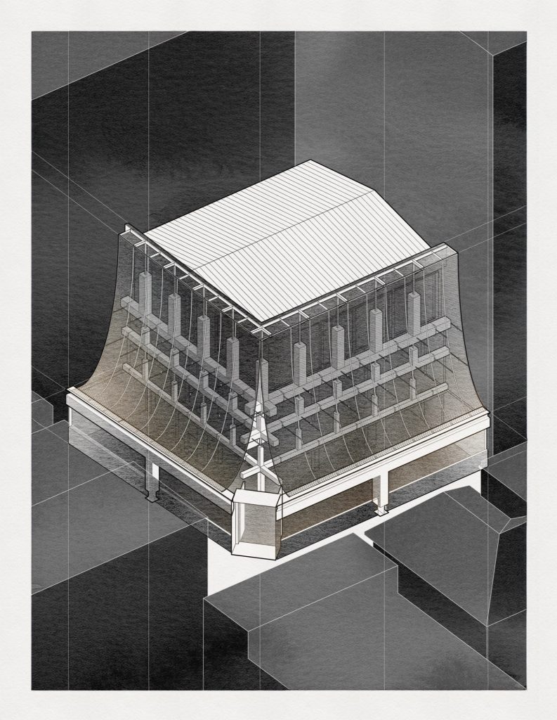 The renovation is organised around the idea of a veil, a membrane that mediates between an animated public realm and a more contemplative interior. A new outer layer of expanded metal mesh is suspended from a concrete and steel substructure, wrapping the villa in a permeable screen. By day, the mesh filters glare and softens the building’s profile, producing shifting gradients of opacity as viewpoints change. By night, it reads as a thin, breathable envelope that holds the house at a gentle distance from the street without sealing it off.