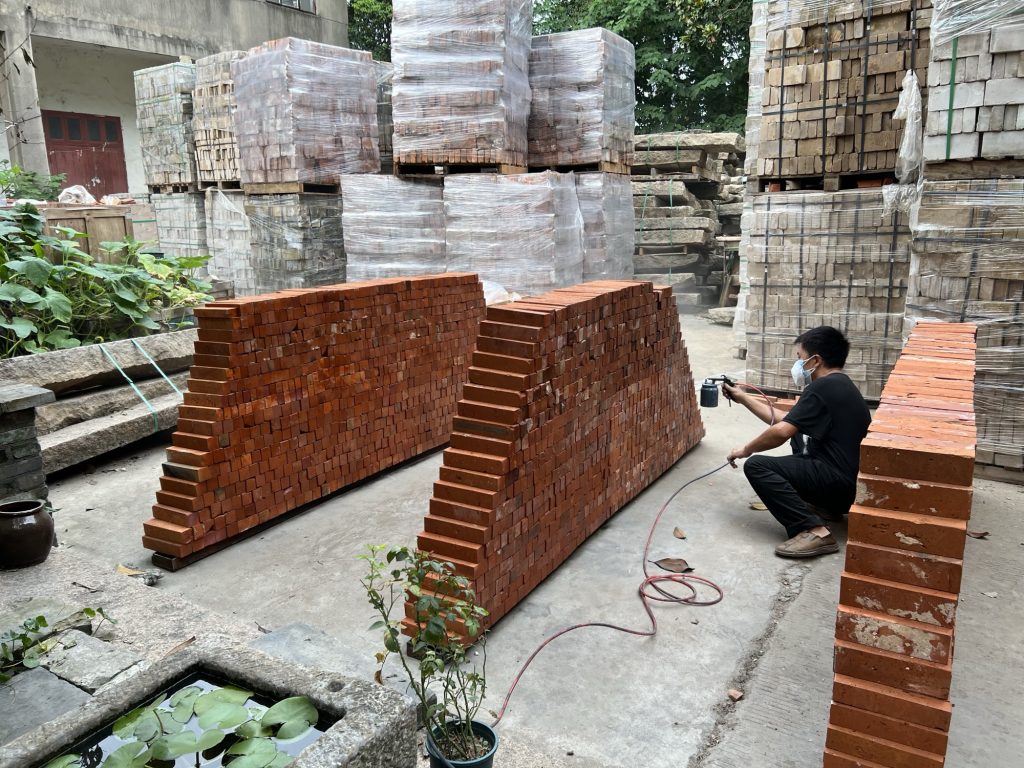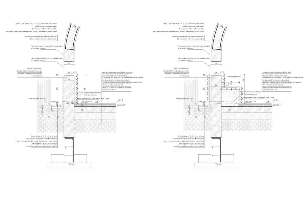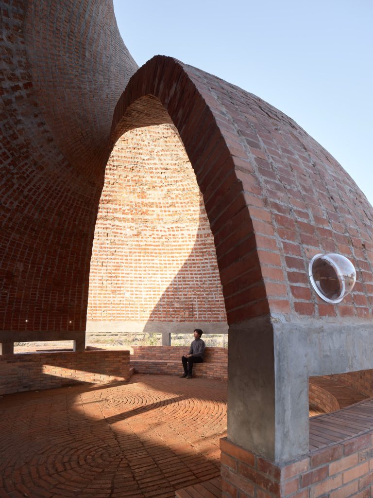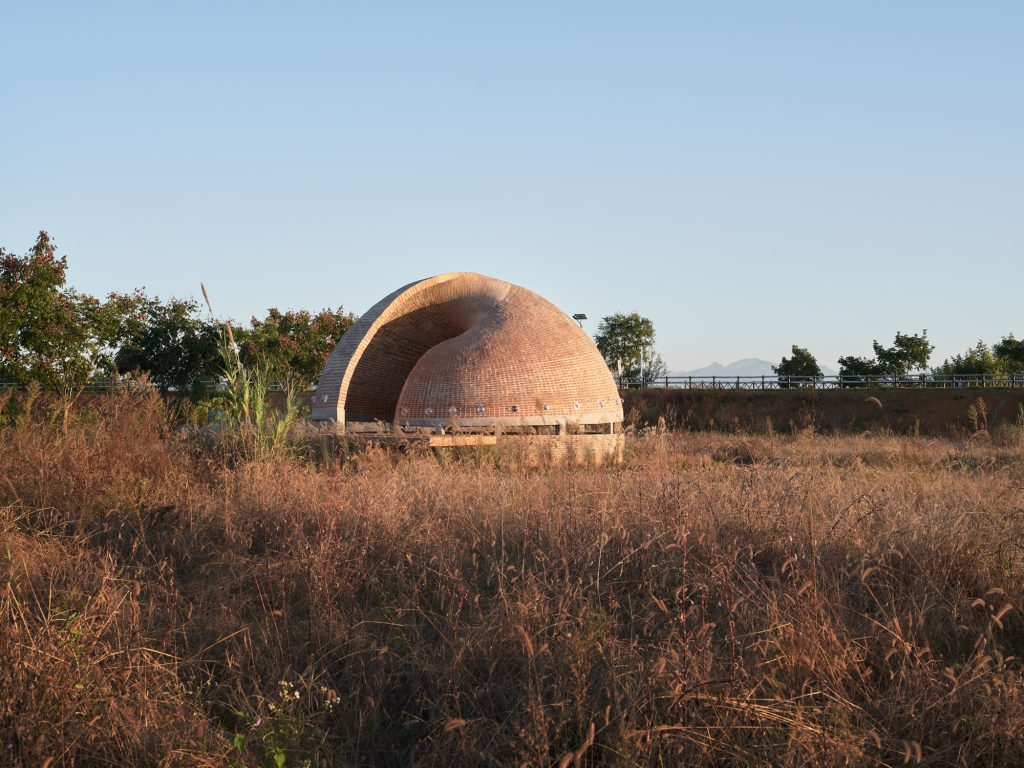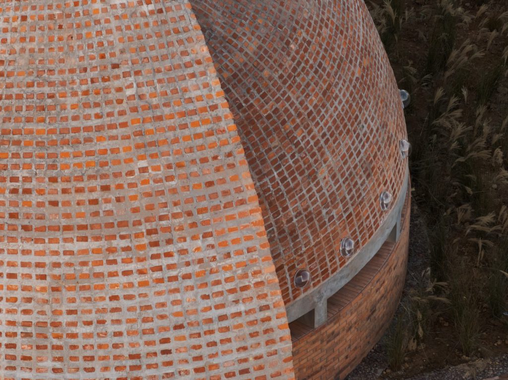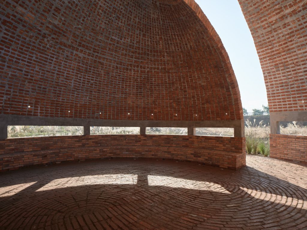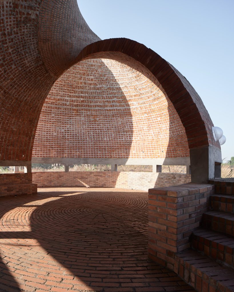 Red brick is the project’s cultural anchor, yet its construction logic resists familiar brickwork. The shell is not assembled through masonry. Instead, it is cast in situ, using bricks as a visible matrix rather than a stacked wall. This shift is more than technical. It reframes brick from a unit of layering into an instrument of curvature, density, and surface continuity.