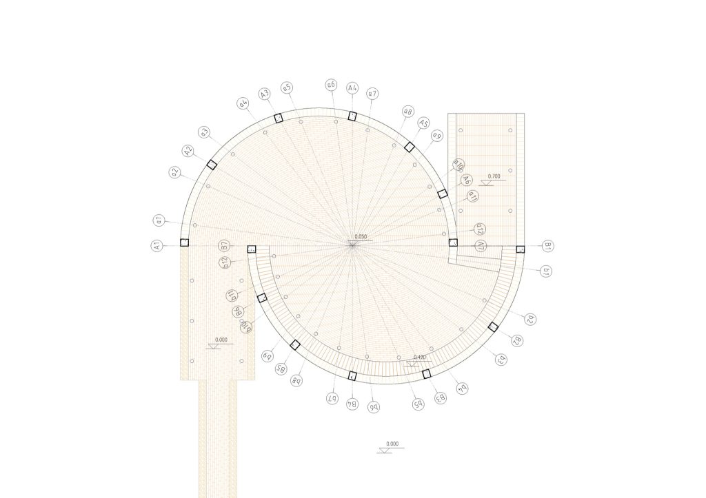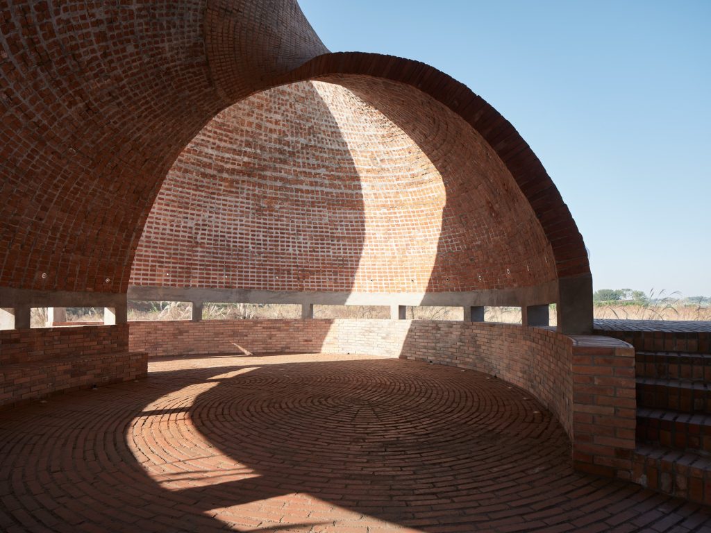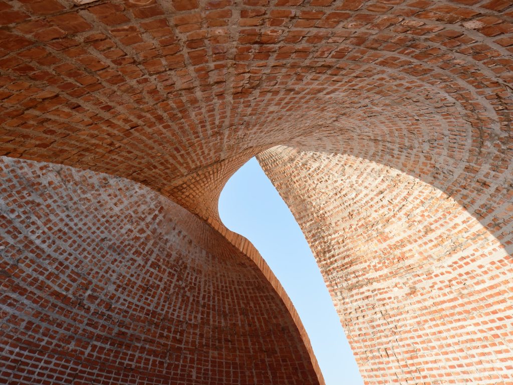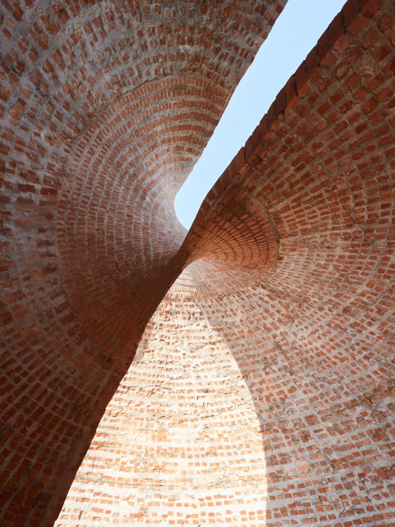 The brick units vary across 12 widths and are distributed along a UV grid to maintain radial continuity. Up close, the surface reads like a pixelated matrix, where the thickness of the so called mortar continually shifts, because the joints are in fact concrete. The familiar tectonics of brick are subverted: instead of predictable courses and seams, the shell offers an interlocking logic that feels both digitally calibrated and materially direct.