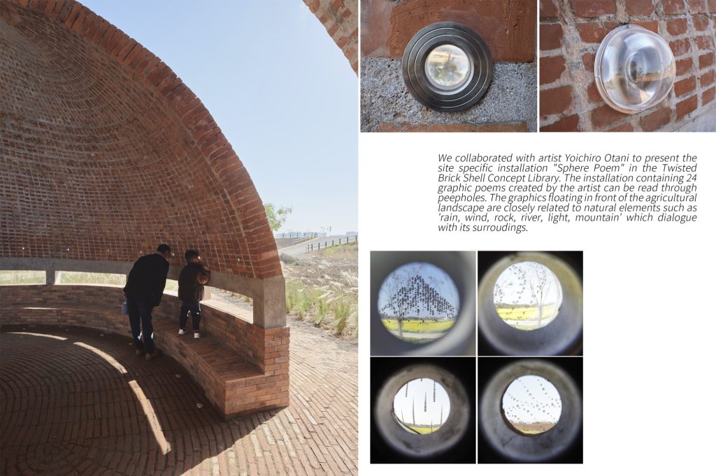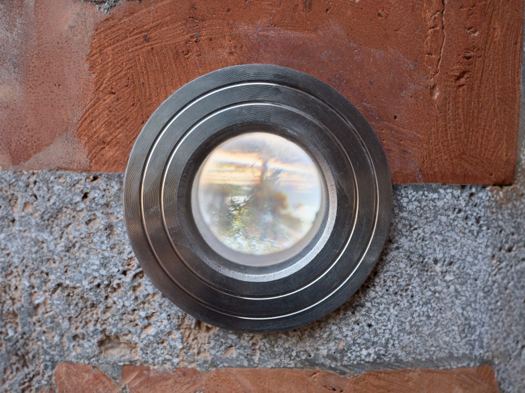 Reading here is deliberately slowed. Texts are held inside acrylic spheres and accessed through small apertures punctured in the brick surface. As visitors lean in, the act of looking becomes a kind of alignment between body and structure. Words and landscape overlap in the same field of vision, producing a brief, poetic connection between mind, terrain, and the present moment of perception.