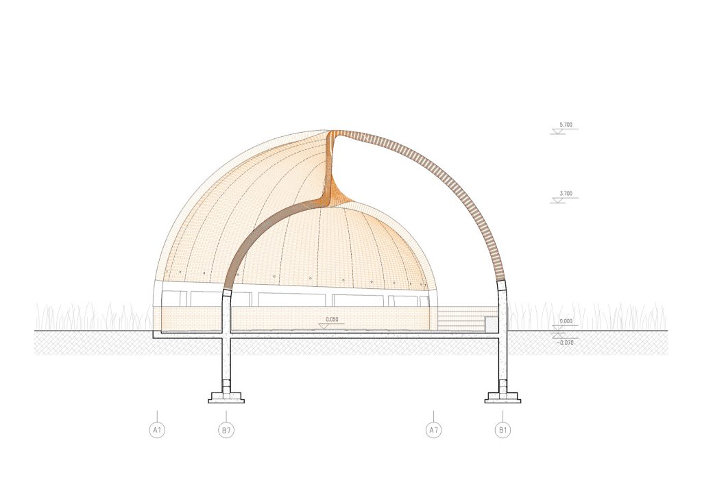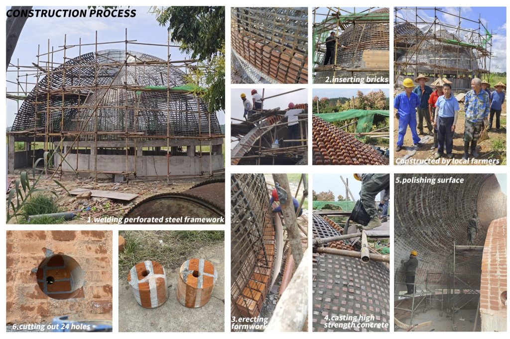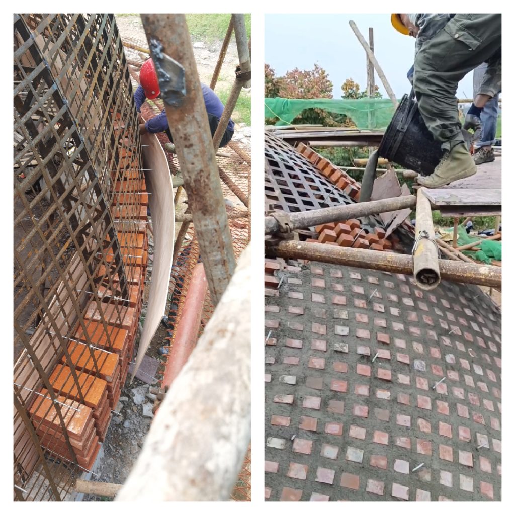 That continuity is also the core difficulty. Distributing bricks across a double curved surface becomes a construction problem as much as a design intention. The solution relies on perforated steel plates that act both as a positioning guide and as a reinforcing framework. High strength concrete is then poured to bind the assembly, allowing brick, steel, and concrete to operate as a single structural system.