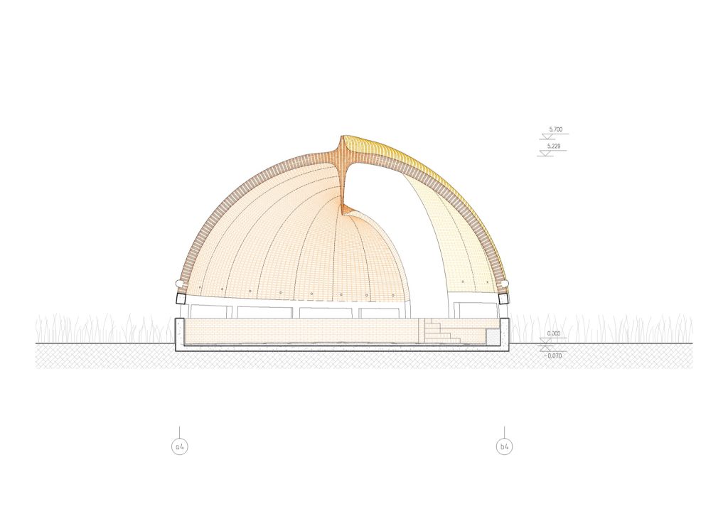 At roughly 10 metres in diameter and 5 metres high, the library is defined by a continuous surface generated through the sweep of two semicircles that roll into one another. The gesture collapses boundaries. Outside becomes threshold, threshold becomes interior, and the shell reads as both object and landscape condition, a form that seems to have emerged from the site as much as it was placed within it.