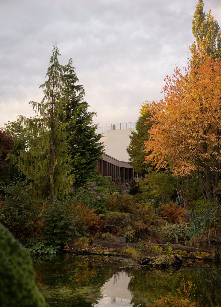 That calibration is felt in the tension between façade and terrain. The exterior reads as clean and modernist against the woodland backdrop, while green roofs return the building to the planted hillside, stitching architecture into ground cover. From certain angles, the retreat holds its line with quiet confidence. From others, it recedes into a continuity of vegetation, creating a measured oscillation between assertiveness and integration.
