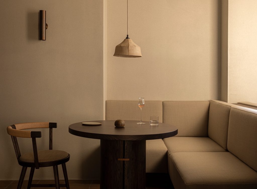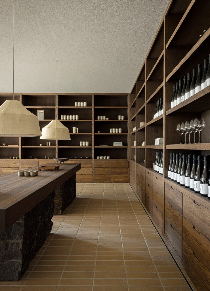 Inside, reception leans into heavier materiality. Brick flooring, exposed timber structure, and textured walls create tactile density and acoustic warmth, encouraging visitors to slow down and register the room through touch as much as sight. Adjacent, the boutique centres its display on a long wooden counter set on carved stone, a deliberate pairing of craft and geology that echoes both the surrounding landscape and the estate’s culinary culture, with Restaurant ÄNG as a distant reference point.