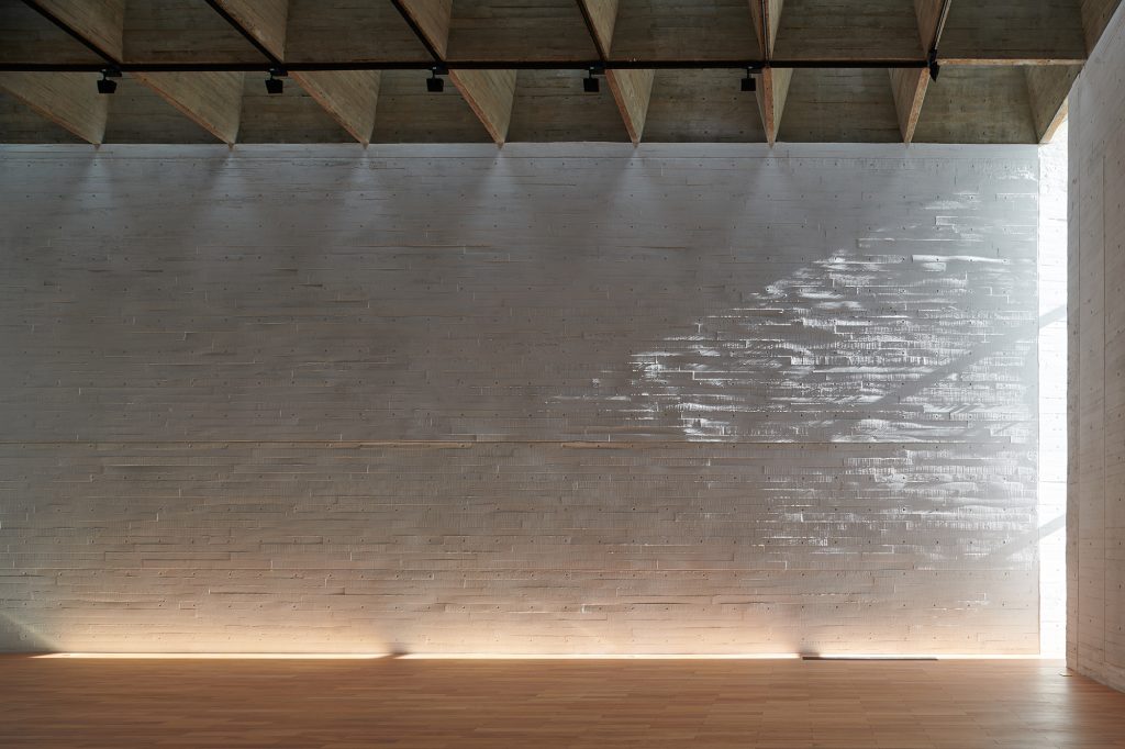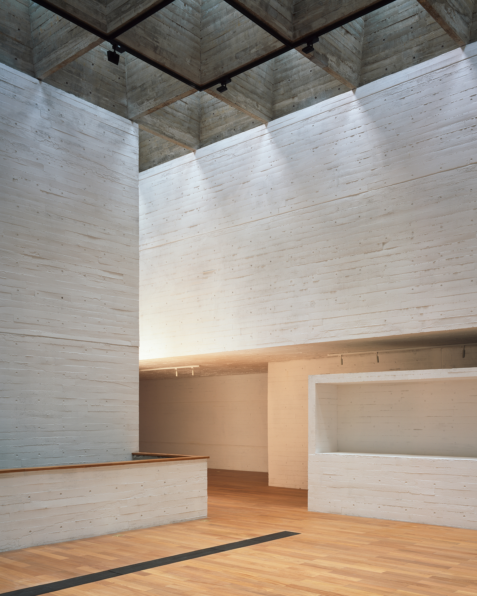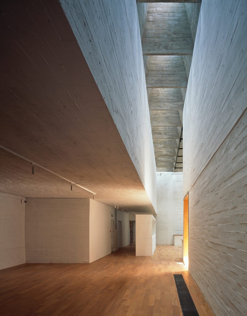 Within the galleries, daylight is filtered and softened by skylights. Light penetrates through a 1.9 by 1.9 meter grid of waffle beams, producing a homogeneous illumination that avoids dramatic contrasts. The effect is immersive without being theatrical, a calm brightness that supports looking, staying, and moving at a measured pace.