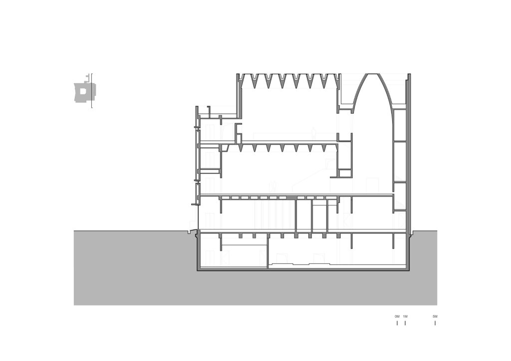 From here, a footbridge extends the museum’s reach, connecting across the road to the northern community. The result is a public crossing circulation that remains independent from the museum’s interior route, allowing everyday movement to coexist with the rhythms of exhibitions. Visitors and local residents are both accounted for, not as separate audiences, but as overlapping publics with different tempos.
