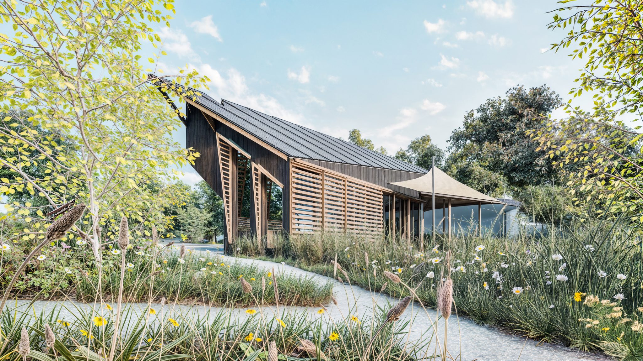 Strategies include extensive native woodland planting, sections of hedgerow and wildflower meadow, and the introduction of larger stock native trees in key public areas such as the access hub, plaza, and main car park. A sedum roof for the visitor café adds ecological value at building level, while raingardens and bio swales integrated into the sustainable drainage system create new habitats and manage surface water.