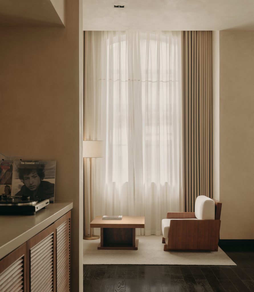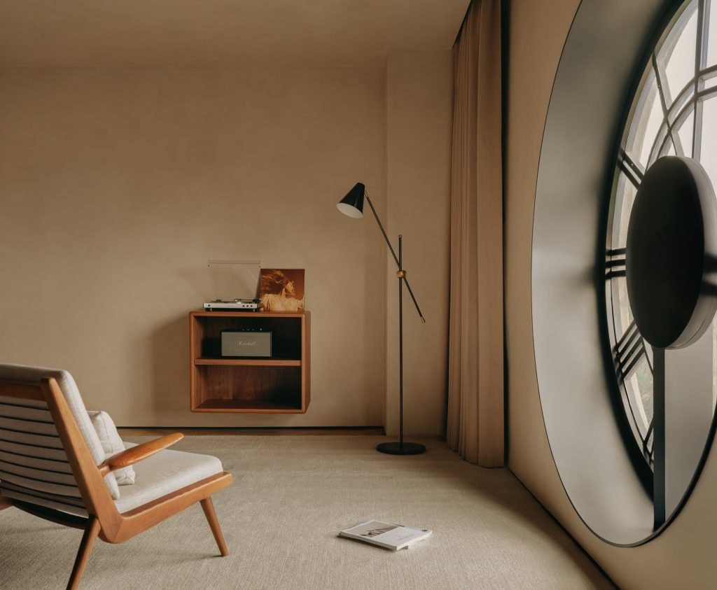 Music is embedded as part of the experiential framework. Each suite includes a vinyl record bar, while a self service listening area in the lounge extends this atmosphere into the shared spaces. Sound becomes a temporal medium, marking presence and memory within the journey of the guest, and reinforcing the hotel’s ambition to construct experience through sensory continuity rather than spectacle.