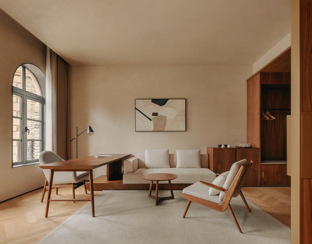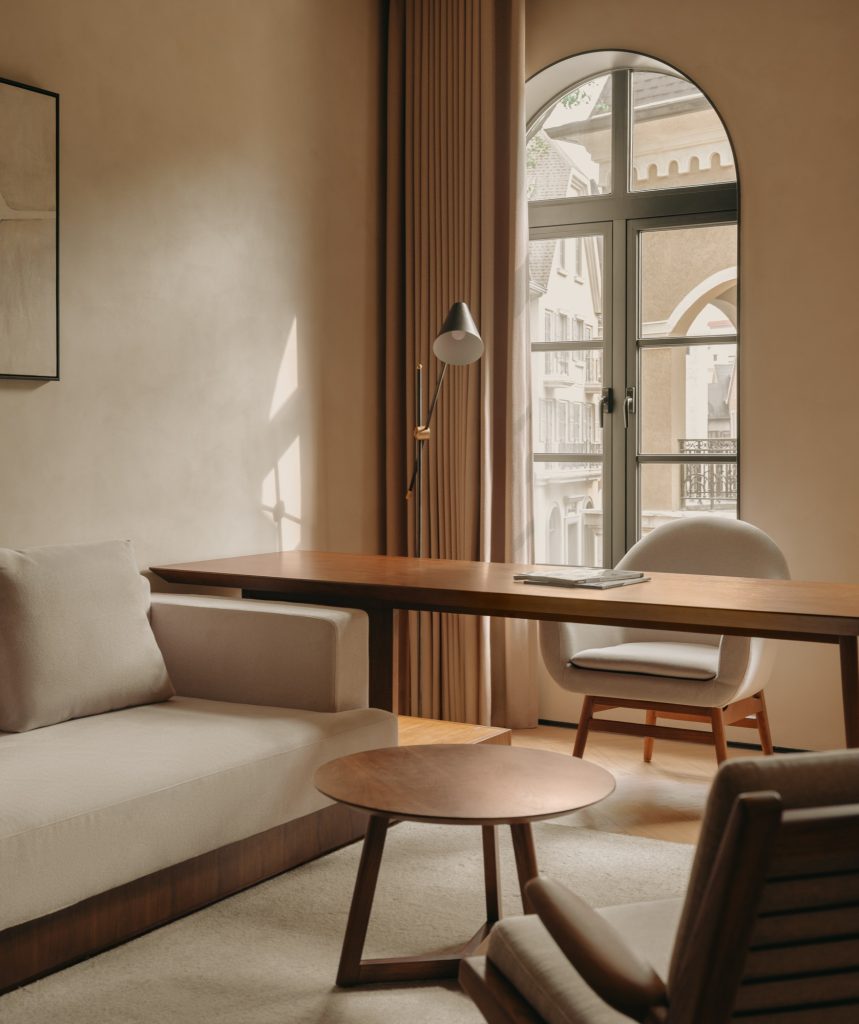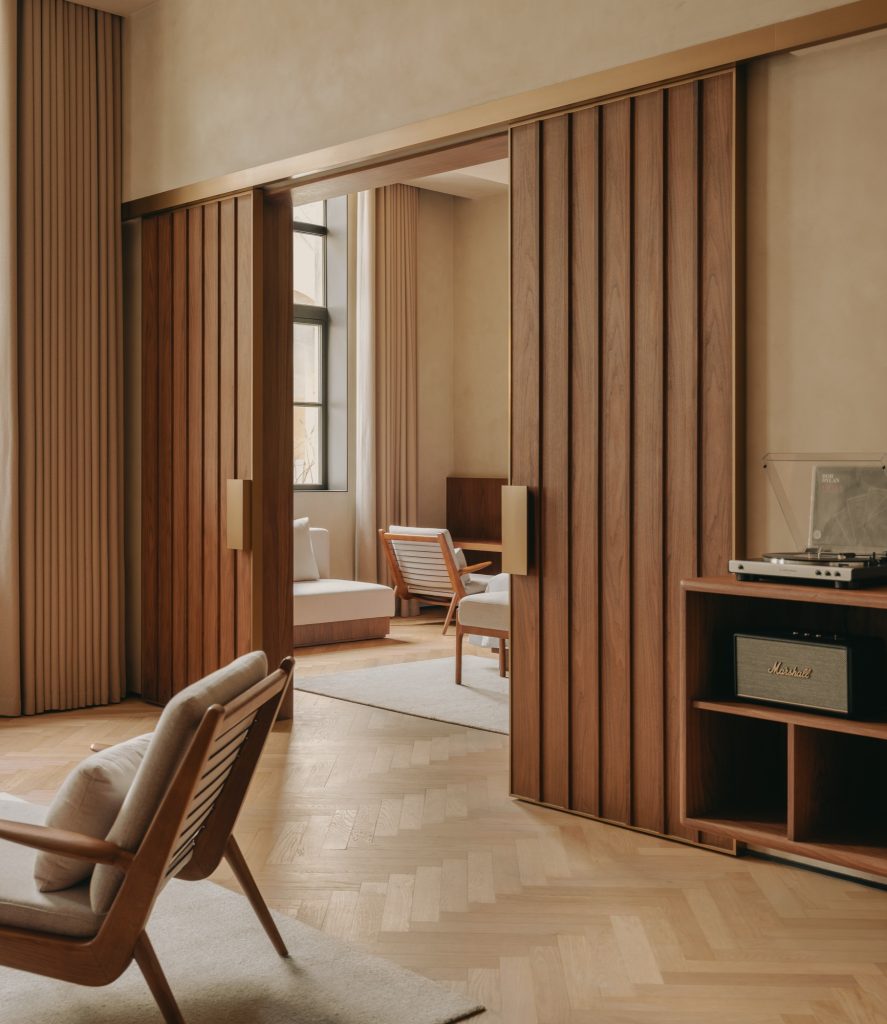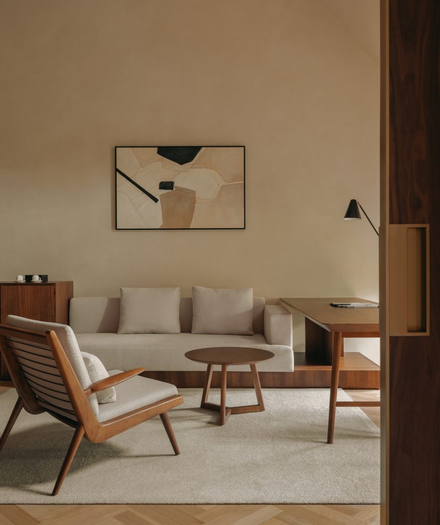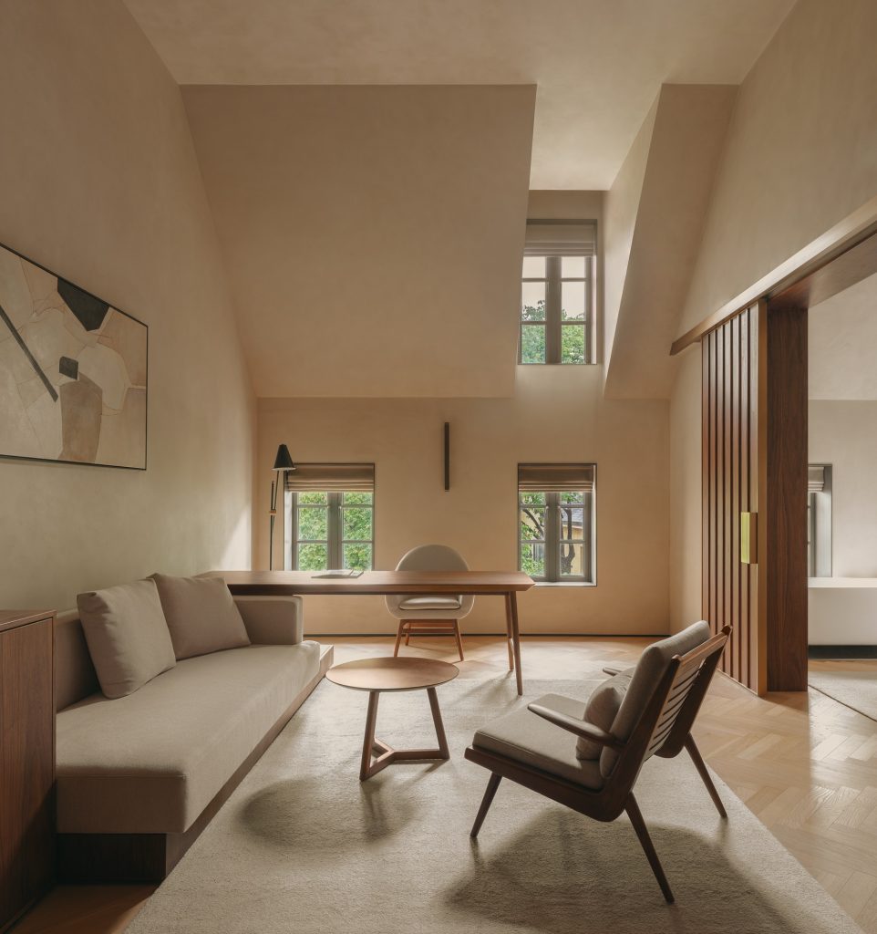 Material and atmosphere extend this dialogue with the past. Warm tonal references from the façade are drawn inward, translated into tactile interior surfaces. Architectural elements are abstracted into textures that can be touched and inhabited, while timber furniture introduces a sense of depth and temporal resonance. The result is an interior that does not replicate history, but allows it to remain perceptible through material presence and spatial proportion.