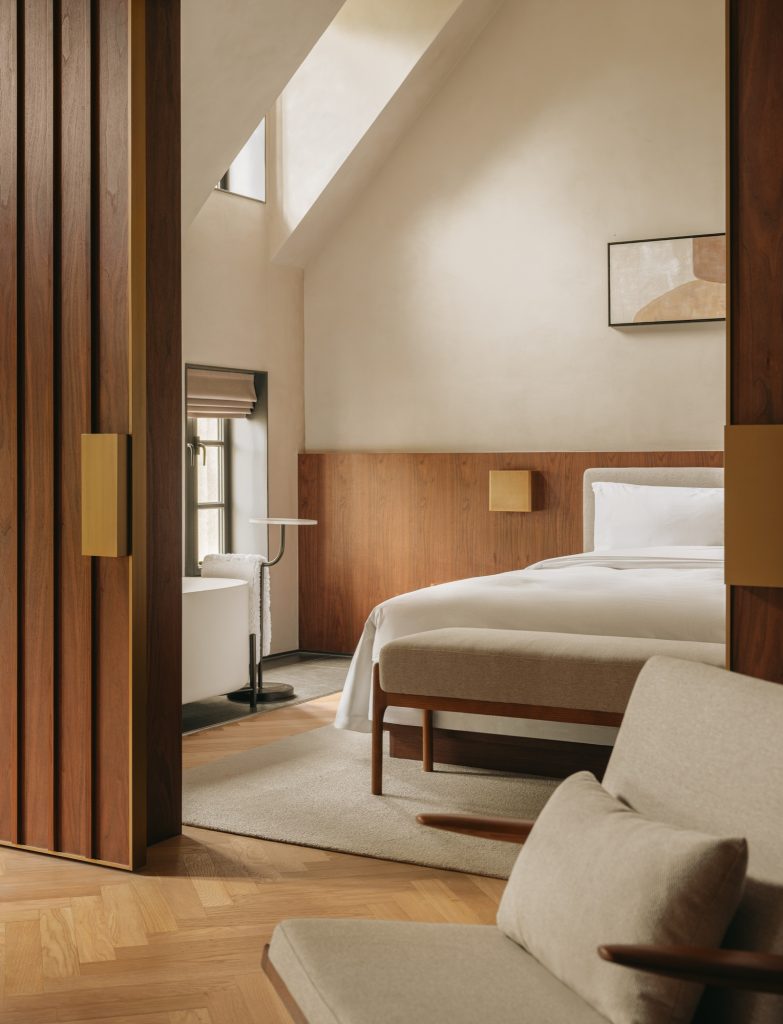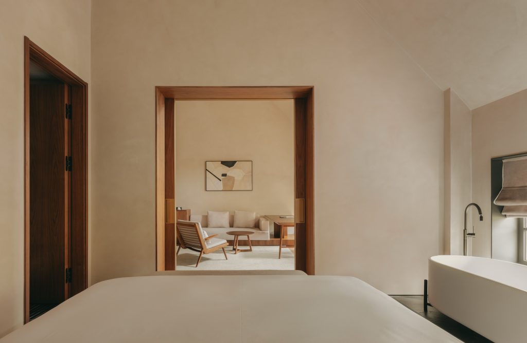 YIN HOTELS is conceived entirely as a suite based hotel, offering five room typologies that accommodate families and small groups. Each unit is structured to maintain visual continuity between bedroom and living area, with sliding partitions enabling flexibility between openness and privacy. The spatial narrative of the guestroom is defined by a subtle reconfiguration of intimacy. The bathtub is positioned between the bed and the window, transforming a functional element into a focal point that frames both interior life and outward views. This arrangement dissolves conventional boundaries between bathing, resting, and observing, producing a layered domestic landscape within the hospitality setting.