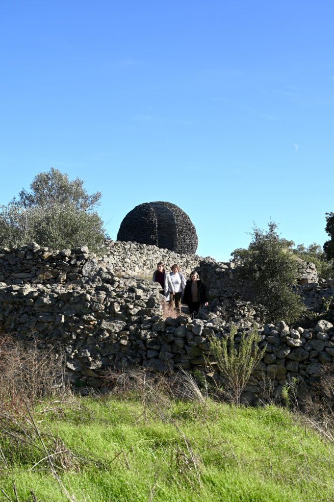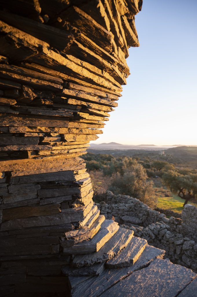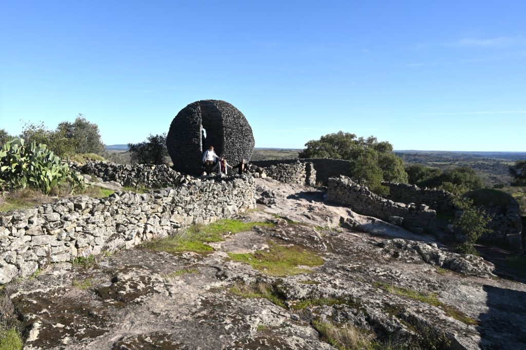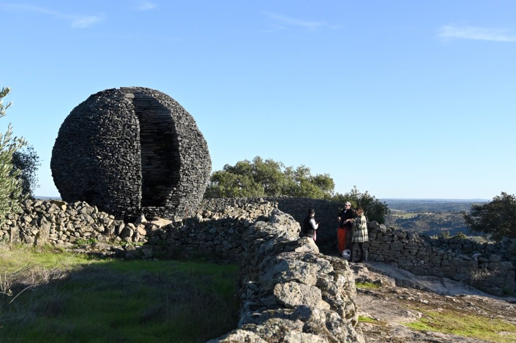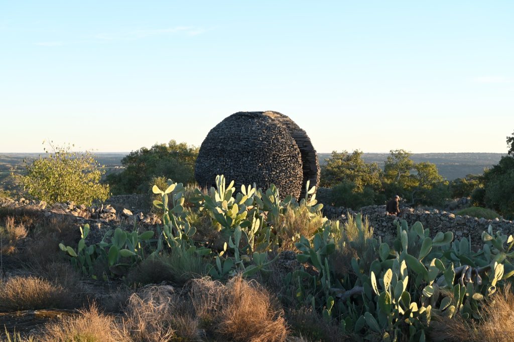 The artwork is situated within a cluster of abandoned furdas, dry stone enclosures once used for pig farming. Built on a granite base eroded by wind and rain, these low walls and small shelters form a micro landscape marked by human labor, heritage value, and archaeological significance. Open to the elements, the site offers expansive views east toward Spain and the Castelo de Peñafiel, and west toward the Portuguese interior. Conceived directly on site, Ninho Globo responds to a place in constant transformation, shaped by wind, sun, and the slow movement of celestial bodies across a borderland terrain.
