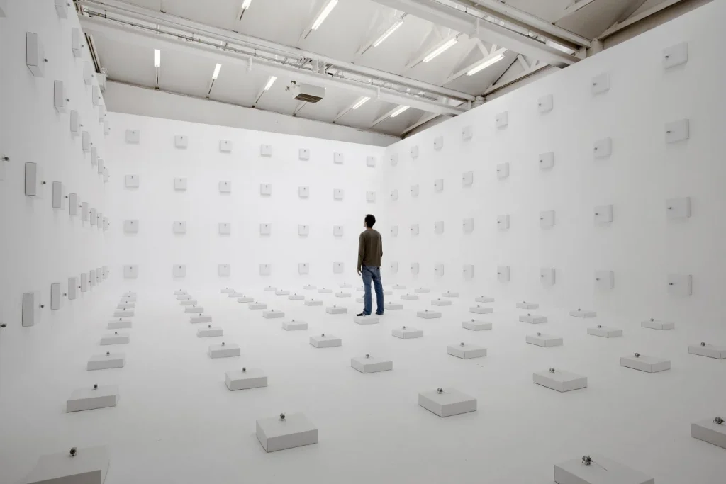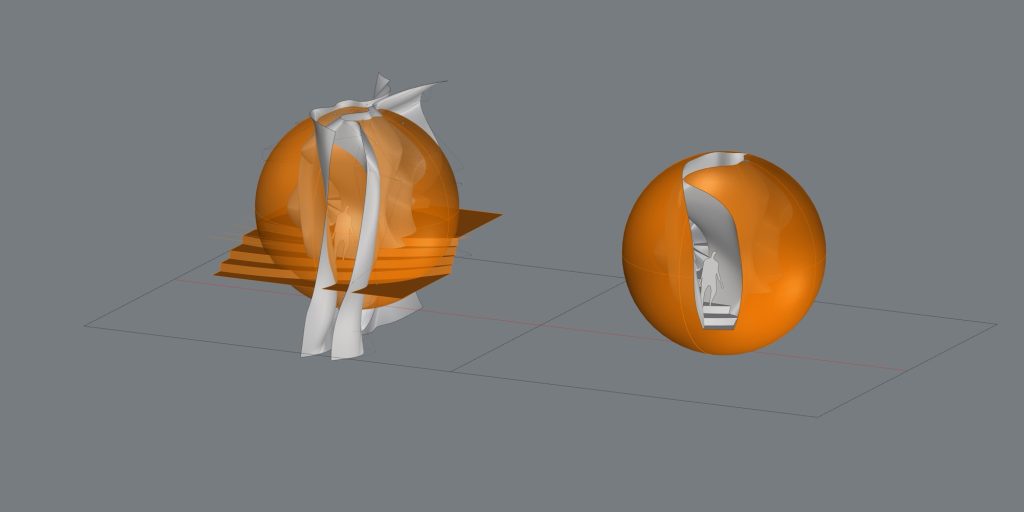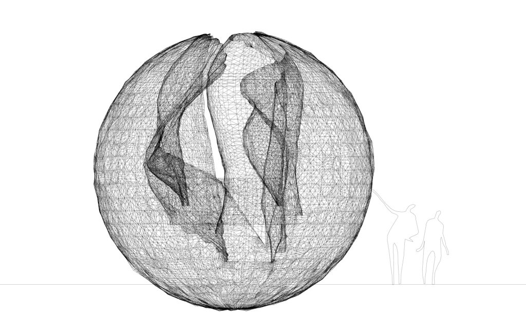 The sphere is invoked as an essential geometric figure, recalling planetary bodies and an awareness of the Earth as a shared habitat. Rooted in mineral origins, it represents an equilibrium between matter and space, stability and latent movement, gravity and balance. Its form suggests permanence, yet it is experienced through the body, requiring proximity, touch, and movement to be fully understood. In this way, the work operates at once as a symbol and as a spatial condition.