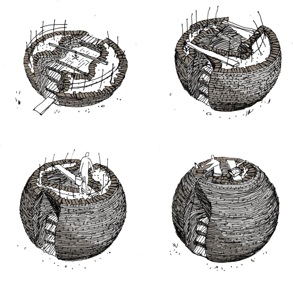 With a diameter of five meters, the sphere was conceived and realized through several residencies in Salvaterra do Extremo. These stays fostered exchanges and workshops with local residents, embedding the project within the social fabric of the village. Built by the artists together with local workers, the process relied on simple, low technology methods chosen to respect the site and encourage collective participation.