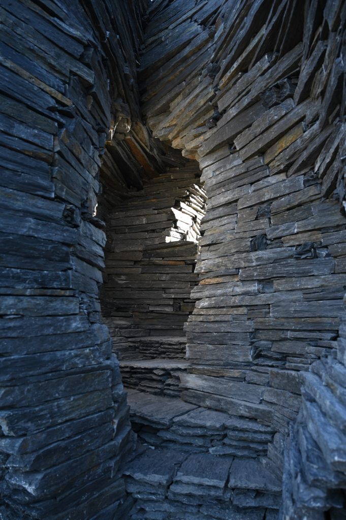 A narrow fissure cuts through the stone mass, inviting visitors inside. This opening evokes both the trace and the absence of water, a precious element whose role in shaping the surrounding landscape is evident in the Rio Erges canyon nearby. Moving through the hollowed interior recalls natural cavities and rocky shelters, primitive architectures where life finds protection and the conditions to endure.