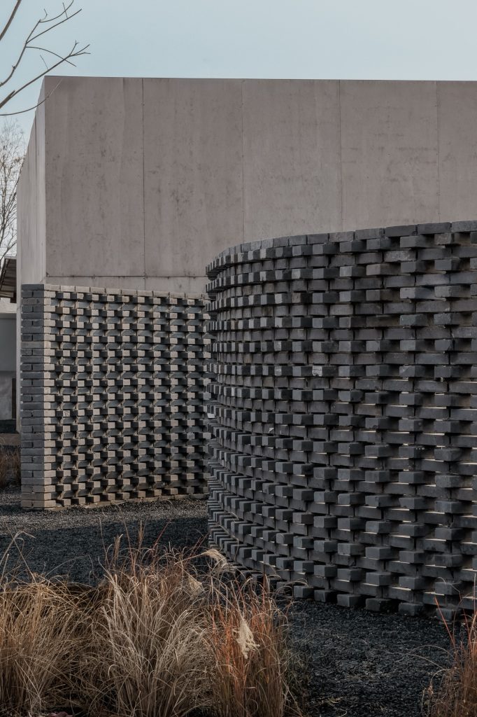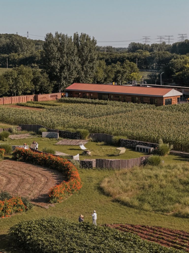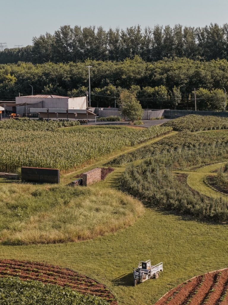 The farm’s perimeter is defined by a modest gray brick wall that establishes a clear yet understated boundary. A minimalist entrance sequence guides visitors inward, where semi transparent brick walls recall traditional Chinese garden architecture. Perforated masonry allows light and air to pass through, casting shifting patterns on the ground and creating a gradual transition from enclosure to openness. This choreography of light and movement leads visitors gently into the cultivated fields beyond.