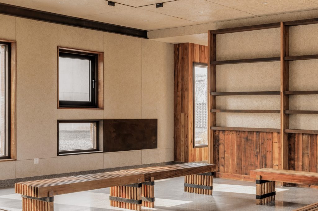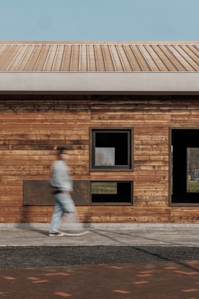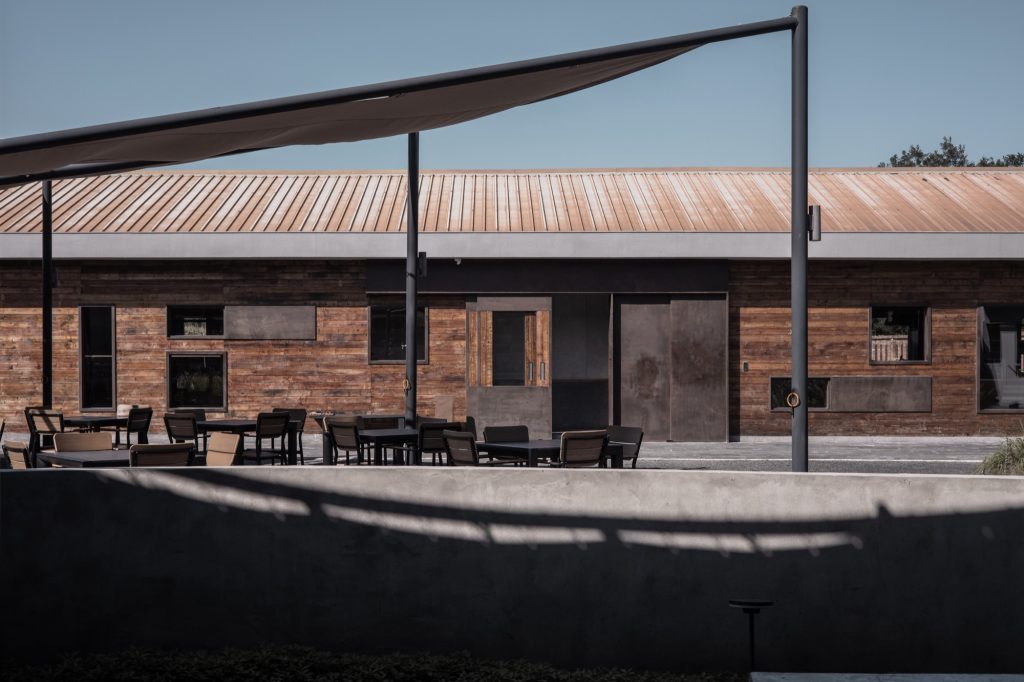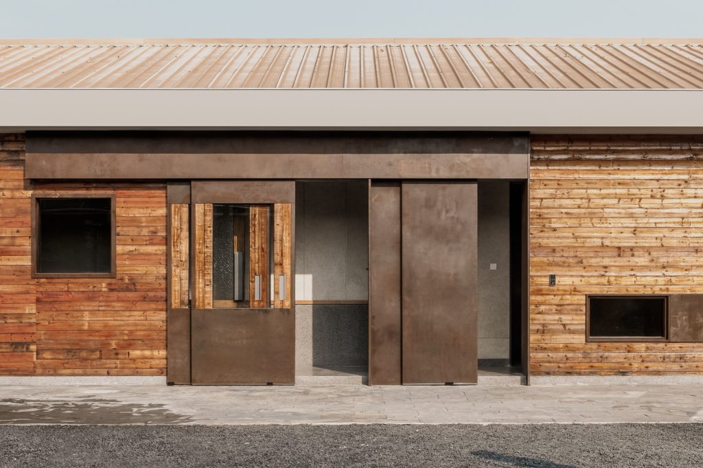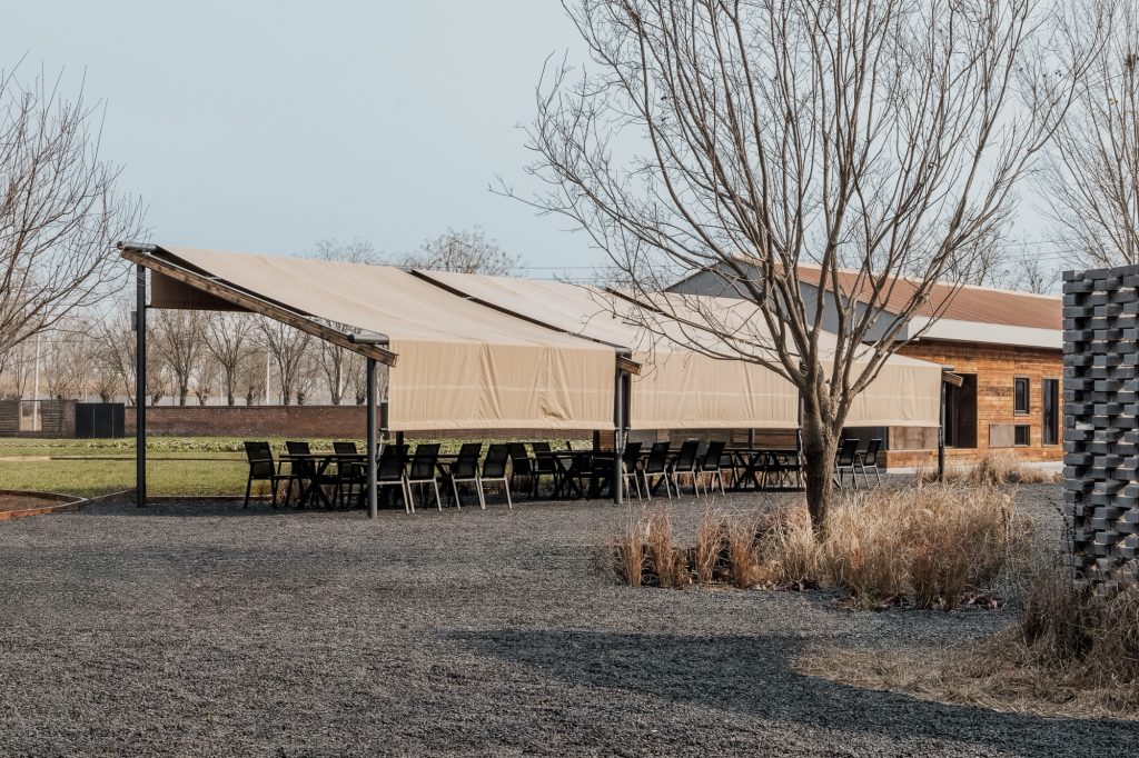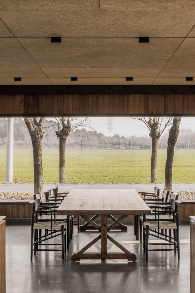 The renovation of the restaurant building preserves the original steel structure and corrugated steel roof, retaining the site’s industrial memory. Modular wall systems ensure thermal comfort across seasons, while carefully positioned vertical and horizontal windows on the north and south elevations frame views of the farmland. Exterior finishes of reclaimed timber and rusted steel plates echo agricultural tools and processes, allowing weathering to become part of the architecture’s expression.